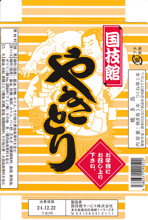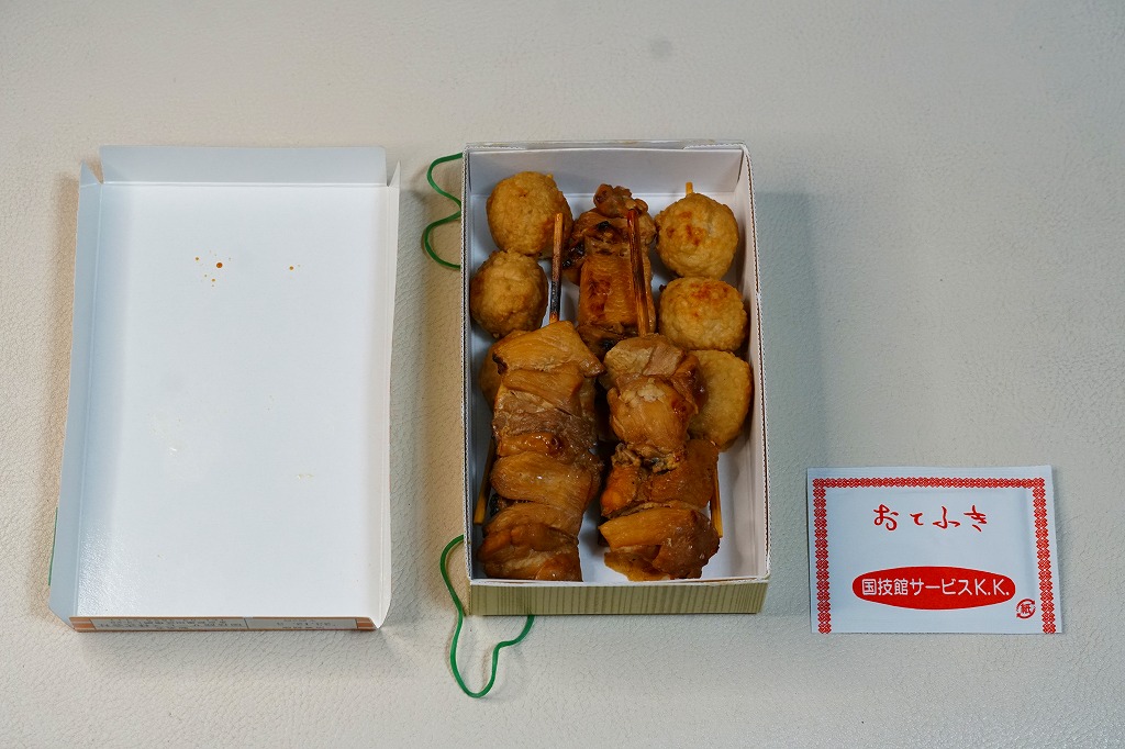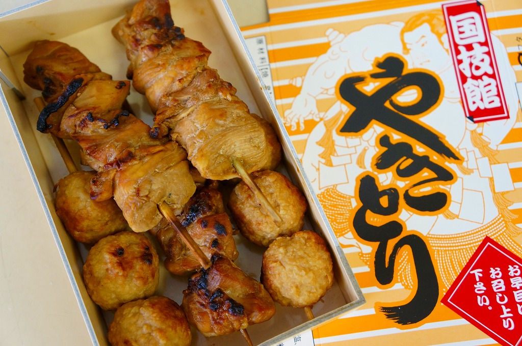 1950年代から国技館での大相撲観戦の名物となっている焼き鳥が、2012(平成24)年8月の東京駅の駅弁売店「駅弁屋 祭」オープンとともに、東京駅構内でも販売されるようになったもの。厚く小さな紙箱の中に、焼き鳥が3本、つくね串が2本、コンパクトに収まる。現在は東京両国の国技館で、土俵の真下の地下工場で製造されているそうな。