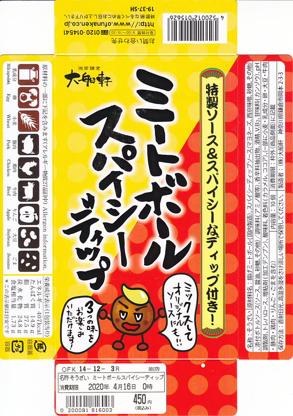 2019(令和元)年の秋までに東京駅の駅弁売店「駅弁屋 祭」で発売か。こんどのおつまみ商品は、小箱にとても小粒な揚げ肉団子10個に、惣菜サイズのソースボトルと、超激辛なマヨネーズ風ソースカップを詰めた。2種のソースの組合せで「3つの味をお楽しみいただけます!」とする。JR東日本グループ会社の事業再編という不思議な理由により、2021年3月限りで終売。
