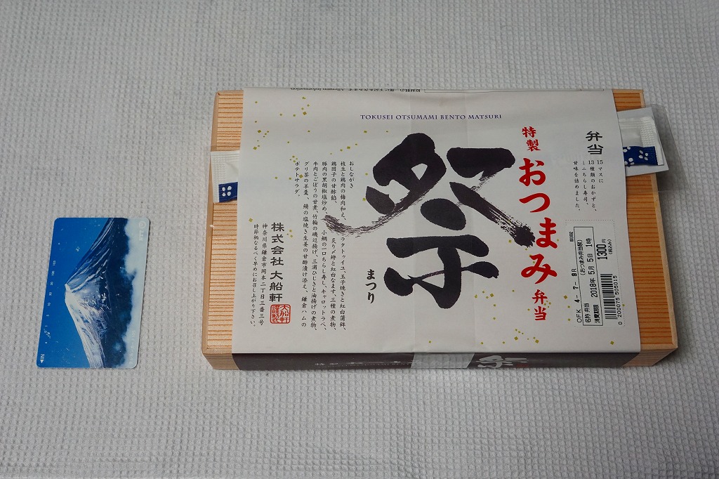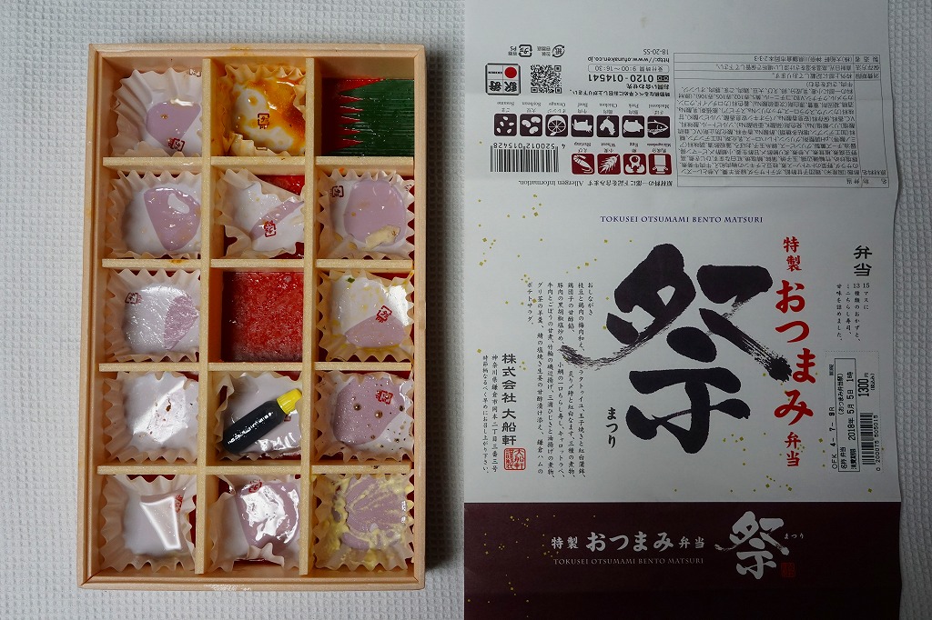 下記の駅弁「特選おつまみ弁当祭」を、2019(令和元)年9月に買ったもの。名前と値段と容器は同じで、掛紙が赤くなり、中身の半分弱が入れ替わっていた。掛紙の上面から側面へ移動したおしながきを転記すると、「グリ茶の羊羹」「牛肉とごぼうの旨煮」「豚肉の塩炒め」「鶏唐揚げ」「サバの味噌煮」「三崎マグロカツ」、「鶏肉の野菜入りパテ」「浅利時雨煮のせ茶飯」「しらすごま油炒め」「彩り野菜のミートボール明太マヨソースがけ」「三浦ひじき煮」「鎌倉ハムとカリフラワーのトマト煮」「コールスローサラダとスモークサーモン」「四種の煮物」「玉子焼きと紅白蒲鉾」で15区画。JR東日本グループ会社の事業再編という不思議な理由により、2021年3月限りで終売。