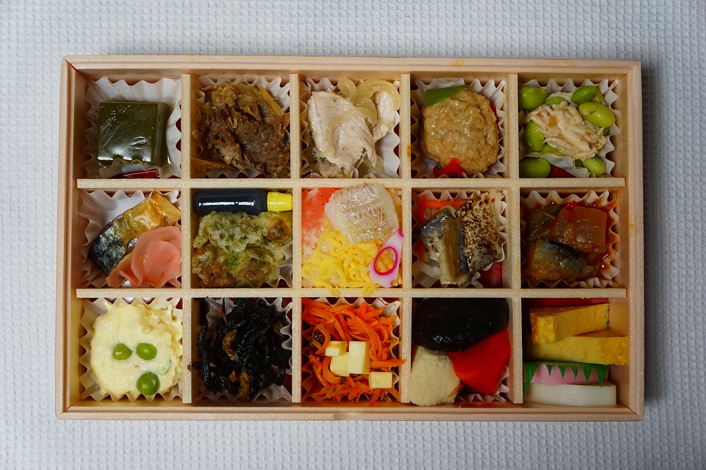 15区画に「枝豆と鶏肉の梅肉和え」「ラタトゥイユ」「玉子焼きと紅白蒲鉾」「鶏団子の甘酢餡」「炙り〆鯖と紅白なます」「三種の煮物」「豚肉の黒胡椒塩炒め」「小鯛の一口ちらし寿し」「キャロットラベ」「牛肉とごぼうの甘煮」「竹輪の磯辺揚げ」「三浦ひじきと油揚げの煮物」「グリ茶の羊羹」「鯖の塩焼き生姜の甘酢漬け添え」「鎌倉ハムのポテトサラダ」で、13種類のおかずとミニちらし寿司と甘味を詰めたと、掛紙に書いてある。この売店で人気になった青森駅弁「ひとくちだらけ」を、都会のセンスで作ったらこうなった感じの、名前どおりのおつまみ弁当。