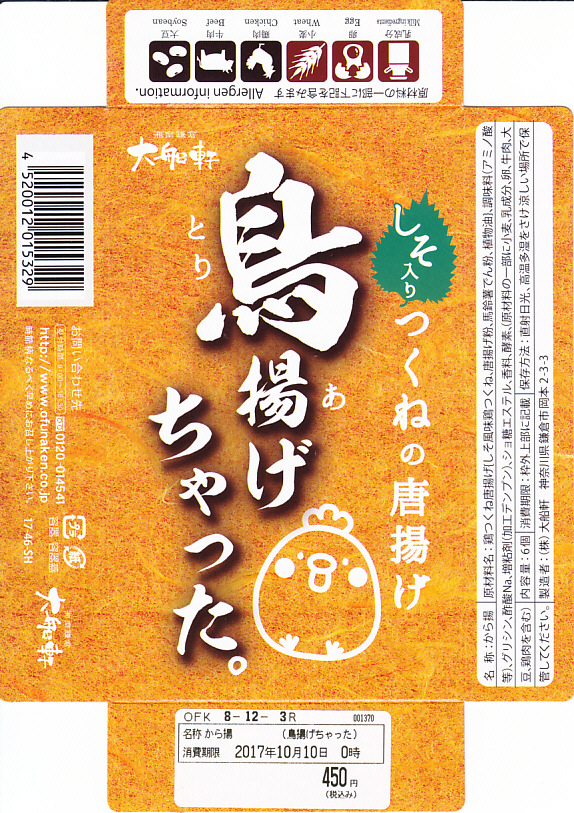 2017(平成29)10月に東京駅の駅弁売店「駅弁屋 祭」で発売か。森駅弁「いかめし」や、「国技館やきとり」「チキン弁当のからあげ」「三崎マグロの串揚げ」などと同じような、この駅弁売店でのレジ横商品。一口チョコ大に整形された、しそ入り鳥つくね唐揚げが、小さな箱の中のトレーに収まる。これで6個で450円かと思うと、かなりの割高感。2018(平成30)年1月頃までの販売か。