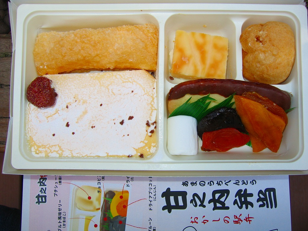 2007(平成19)年3月13日から3,000個が販売される、幕の内駅弁に見立てたデザートボックス。東京駅の幕の内駅弁と同類な構造の容器を使用、中身は日の丸御飯としてティラミスとドライストロベリー、玉子焼としてチーズケーキ、春巻としてサクサクパイ、蒲鉾としてヨーグルトゼリー、唐揚としてシュークリーム、焼鮭としてチョコビスケット、煮物類はマシュマロに、プルーン、アプリコット、マンゴーのドライフルーツ。