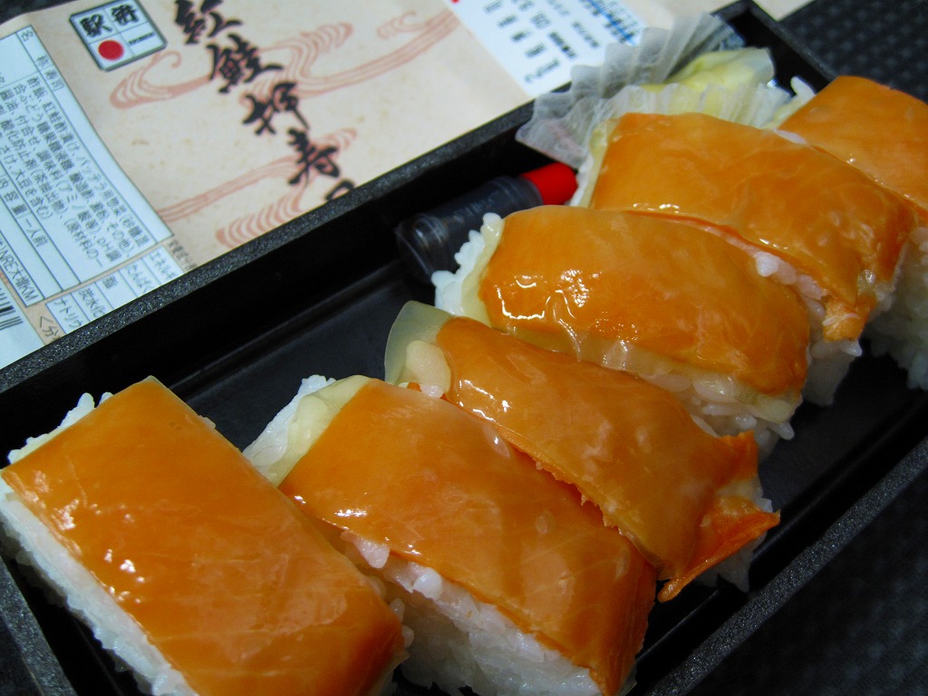 おそらく2007(平成19)年8月の東京駅寿司駅弁全面リニューアルで発売。内容は商品名どおりの、紅鮭のバッテラが6切れ。紅鮭の紙切れで酢飯を食べる腹の足し。駅弁の鮭押寿司は八戸でも新潟でも鮭が酢漬け紙切れだったと思うので、もともとそういうものだと思うべきなのだろうか。ネット上ではこの価格でこの味は良いぞというコメントが多かった。見た目を変えず、2011年までに商品が大船軒へ引き継がれた。