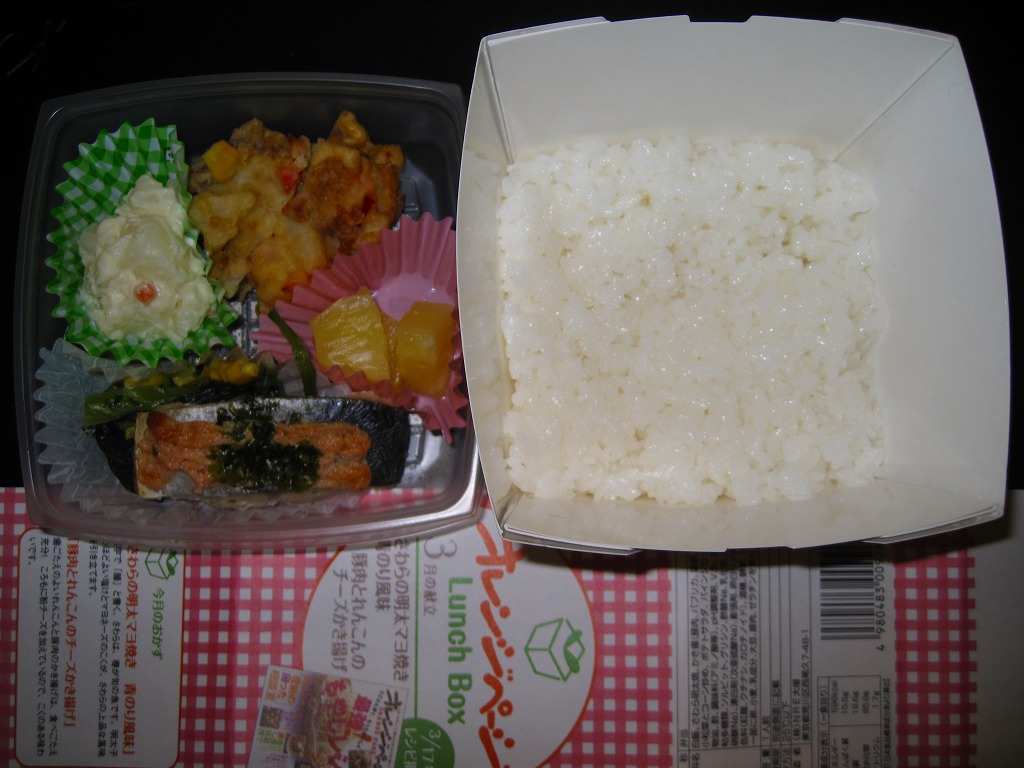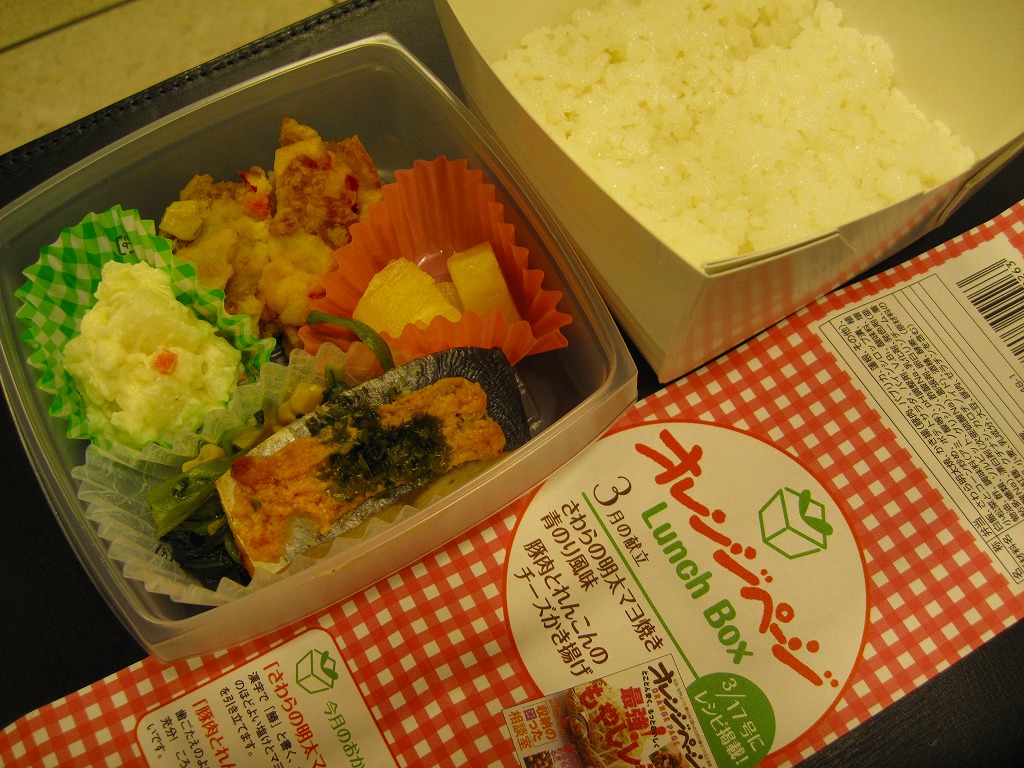 2010(平成22)年2月に発売か。耐水性の真っ白なボール紙を組み立てた容器に、おかずのトレーと一体化した透明なふたをして、商品名と掲載誌と中身などを書いた掛紙で巻く。中身は底面に白御飯を敷き、トレーに「さわらの明太マヨ焼き 青のり風味」と「豚肉とれんこんのチーズかき揚げ」、小松菜のコーン炒め、ポテトサラダ、パイナップル。おかずに対して御飯が多い、おしゃれな軽食弁当。