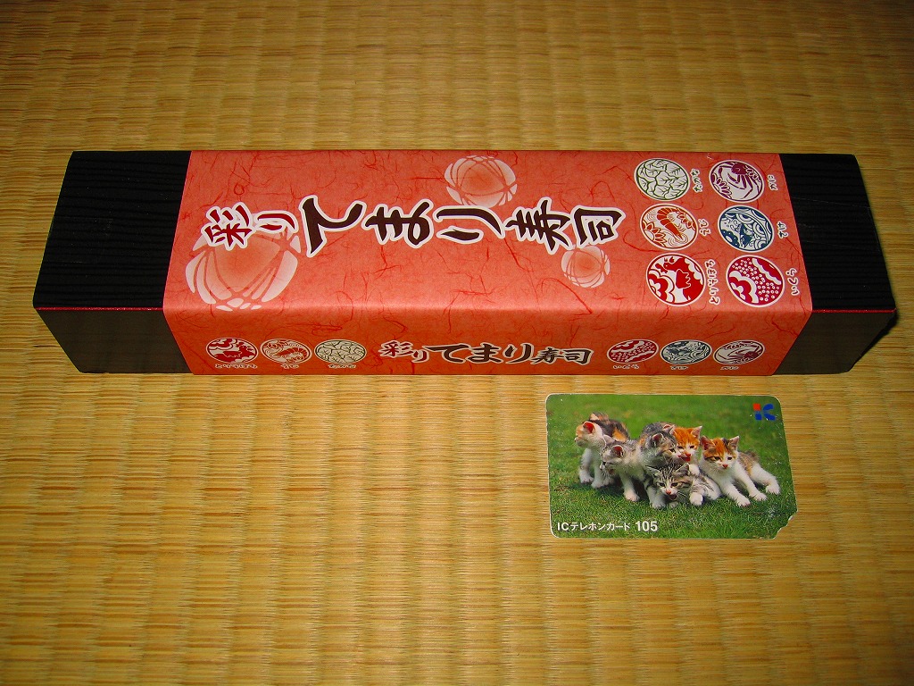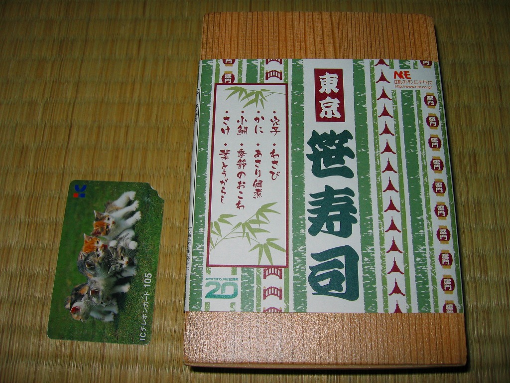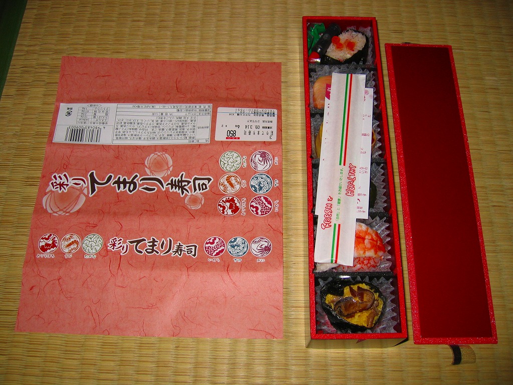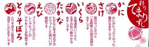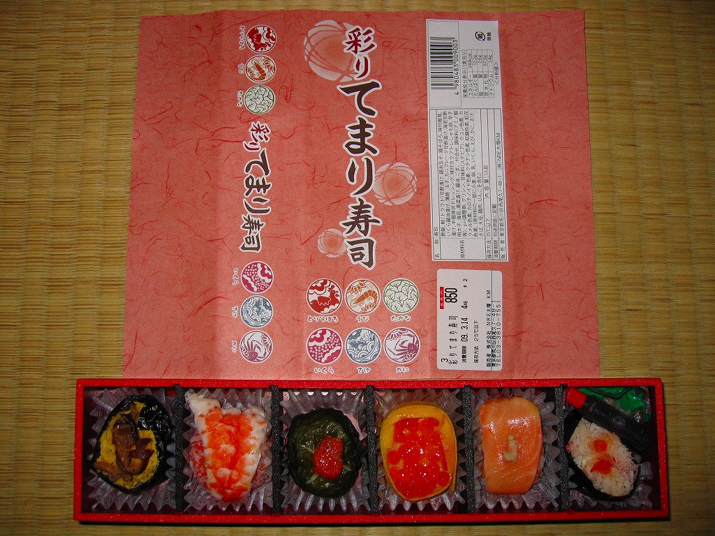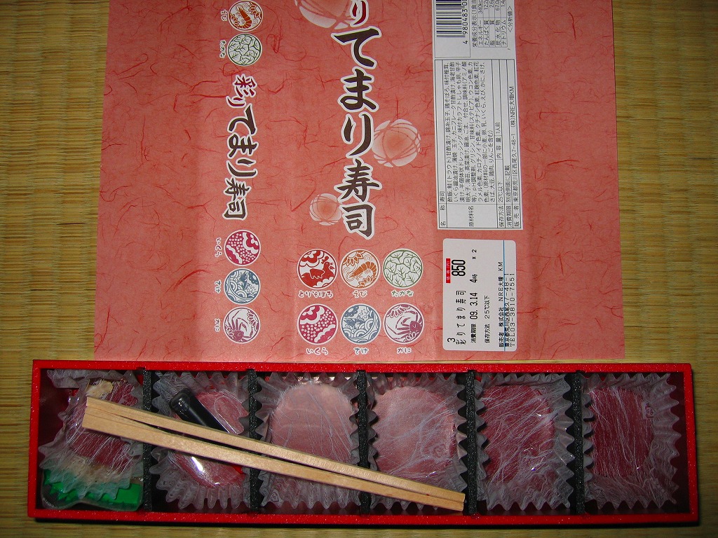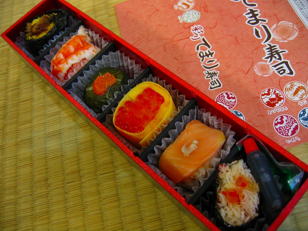2009(平成21)年3月に発売。掛紙やしおりに書かれるとおり、シイタケを載せたとりそぼろ、ししゃもっこを混ぜたえび、辛子明太子を付けたたかな、玉子で巻いたいくら、ゴマ酢飯を使ったさけ、軍艦タイプのかにと、6種各1個の球形寿司が、この順序で直列にて各区画に収まり、この細長く赤い黒塗りの容器を掛紙で巻いている。850円も取るのに少量でさほどうまくないとは何事だと怒るか、価格も分量もお手頃で見た目も風味もかわいらしいとニッコリするか、主観による評価が分かれそうな商品だと思う。数か月間の販売か。