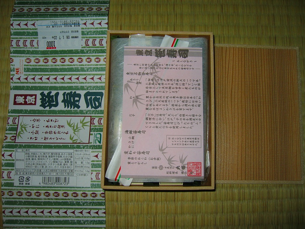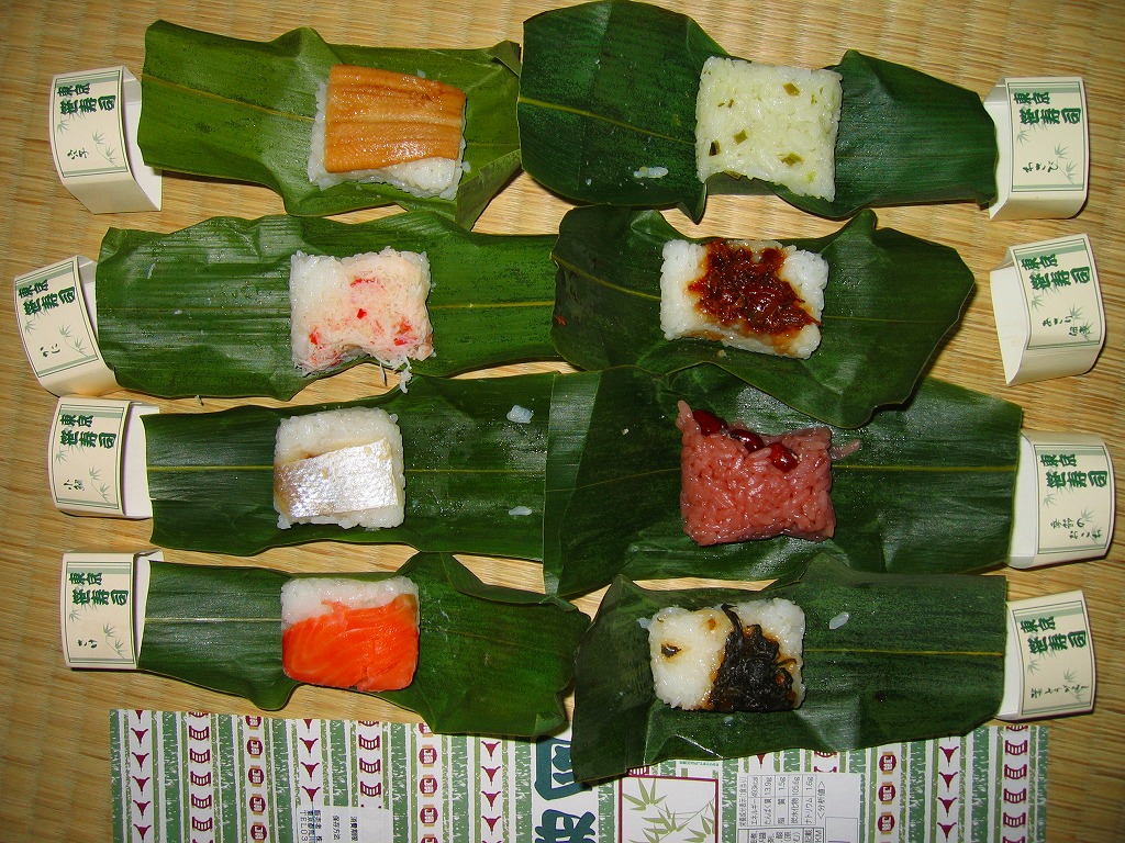 2007(平成19)年の秋頃に発売か。小柄な長方形で木目柄の容器に、駅弁の名前と中身を文字で書いた掛紙を巻く。中身は北陸の駅弁でなんとなく見た覚えがあるタイプの笹寿司で、笹の葉の中にアナゴ、カニ、小鯛、鮭、葉とうがらし、あさり佃煮を載せた寿司が1個ずつと、わさびの混ぜ寿司、赤飯が各1個で合計8つ。その個々に中身を書いた紙帯が巻かれる。