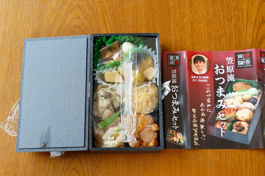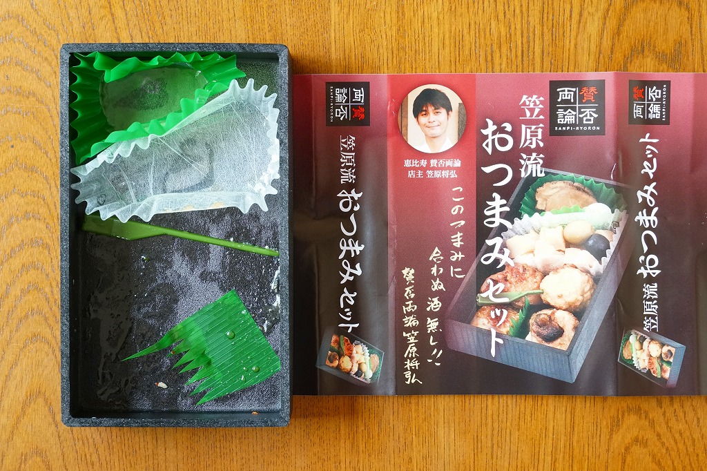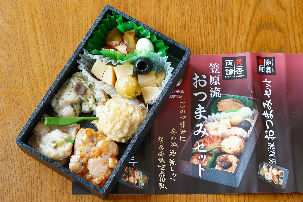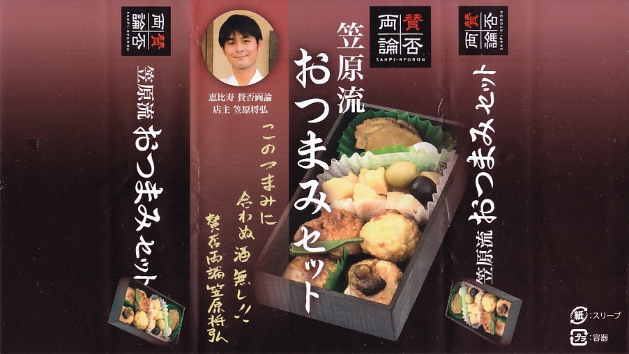 2019(令和元)年6月に東京駅の駅弁売店「駅弁屋 祭」で発売か。2010(平成22)年から東京駅や新宿駅に出没する「賛否両論」ブランドの商品で、2012(平成24)年のこの巨大駅弁売店のオープン時から品揃えされる御飯なし商品の、この時点での最新作。4種の鶏肉にタケノコ煮と漬物が入る、薫るおつまみだった。今回の調製元は羽田空港の空弁屋。半年間ほどの販売か。