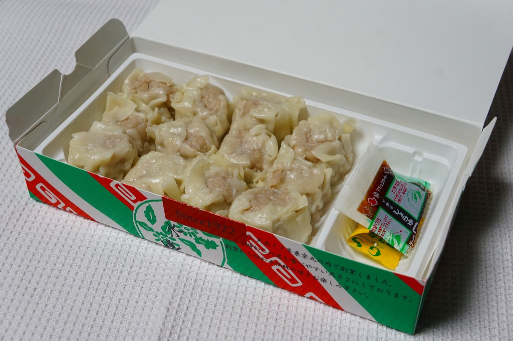 2017(平成29)年の秋に東京駅の駅弁売店「駅弁屋 祭」で発売された模様。調製元の山水楼とは、山梨県は小淵沢駅弁の丸政のことで、2010(平成22)年12月の駅弁売店「ニッポンの駅弁」開店以来の名称。専用の紙箱の中身は、焼売12個、しょうゆ袋、マスタード袋。これらをプラ製トレーごと透明フィルムで密封したお土産品。