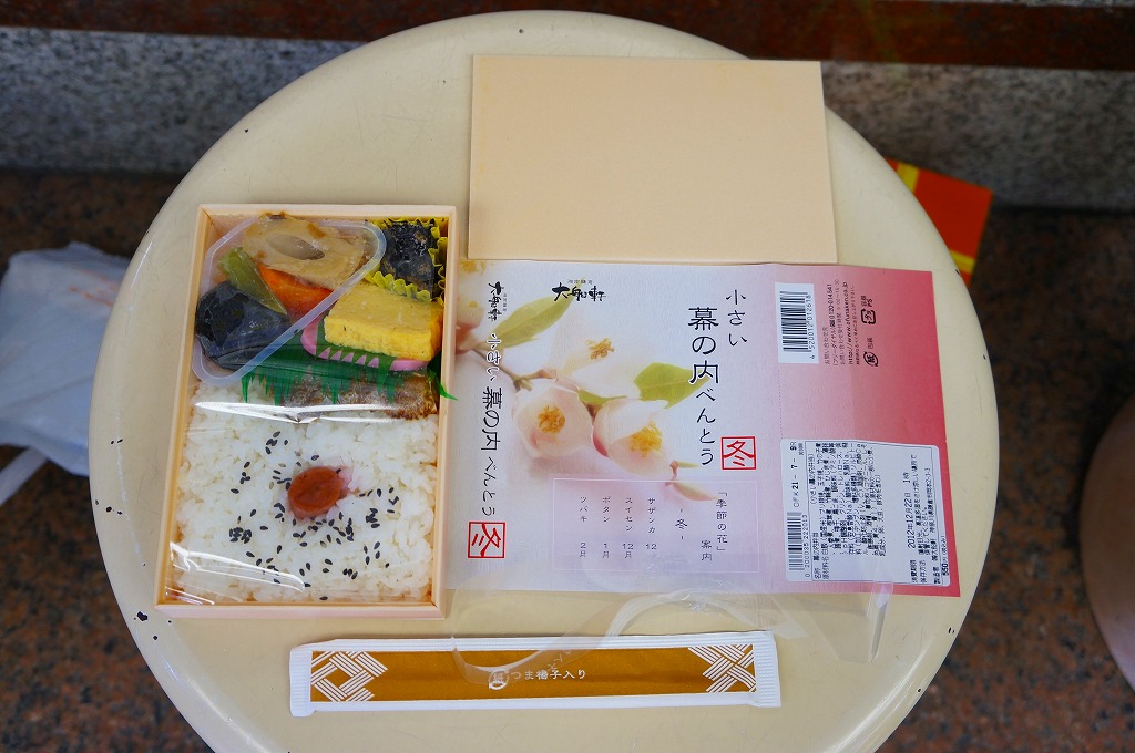 2012(平成24)年12月の発売か。調製元は大船駅の駅弁屋だが、東京駅や小田原駅などのNREの駅弁売店「駅弁屋」シリーズで販売する商品である模様。コンビニ弁当の半分くらいの大きさしかない容器に、日の丸御飯、シイタケやニンジンなどの煮物、ひじき煮、幕の内駅弁で「三種の神器」とされる焼き魚、かまぼこ、玉子焼が、しっかりと入っている。掛紙の使用を含め、その姿は一丁前の駅弁であり、その姿には大船駅の廉価版幕の内駅弁「かあさん弁当」を感じる。掛紙に「冬」とあり、サザンカからツバキまでの季節の花が印字されるが、中身に季節で回せる具材がないような気はした。販売は長続きしなかったのではないかと思う。