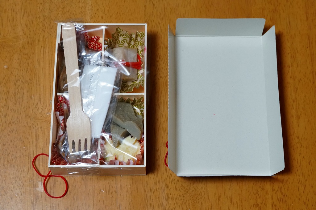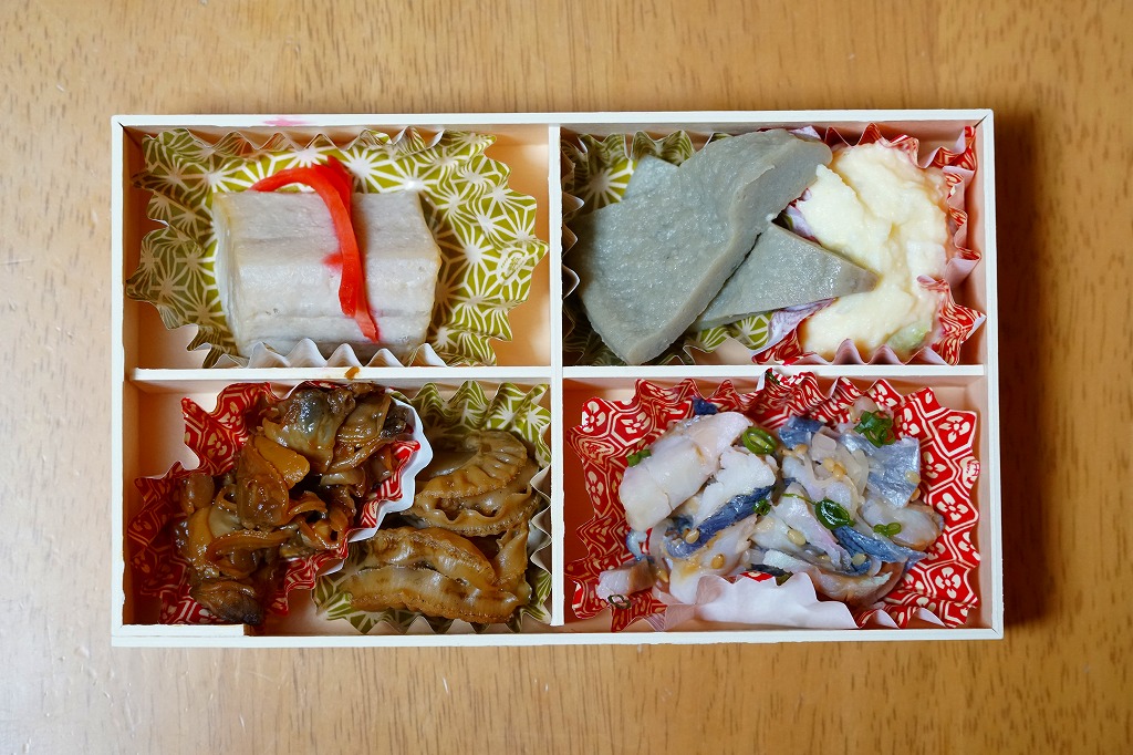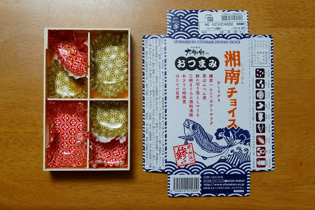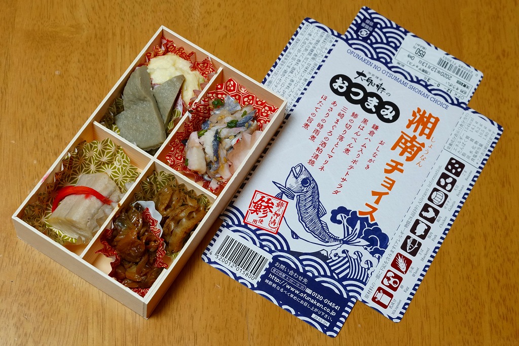 2020(令和2)年9月に東京駅の駅弁売店「駅弁屋 祭」で発売か。今までこの売店で売られてきた、大船駅の駅弁屋がつくる御飯のないおつまみ駅弁と同じサイズのコンパクトな容器を、今回は4分割にして、アジの切り落としマリネ、三崎まぐろの酒粕漬焼、アサリ時雨煮とホタテ旨煮、黒はんぺん煮と鎌倉ハム入りポテトサラダを入れてきた。知る人には分かる、アジやハムなどに込められた大船駅弁らしさ。JR東日本グループ会社の事業再編という不思議な理由により、2021年3月限りで終売。