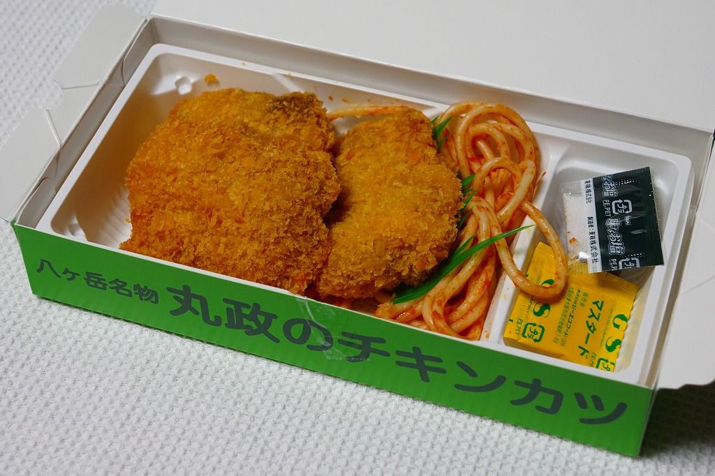 2017(平成29)年12月に東京駅の駅弁売店「駅弁屋 祭」で発売された模様。山梨県は小淵沢駅の名物駅弁「高原野菜とカツの弁当」のチキンカツを、スパゲティ、マスタード、塩とともに密封した商品。これを収める紙箱の絵柄は、小淵沢駅弁にそっくり。密封のせいか、野菜や御飯がないからか、味は湿って沈んでくすみがちで、弁当のときの味が出ていない印象は受けた。価格は2017年の発売時で600円、2024年時点で700円。