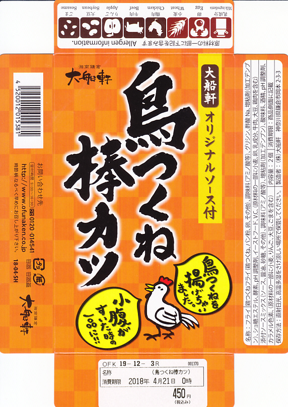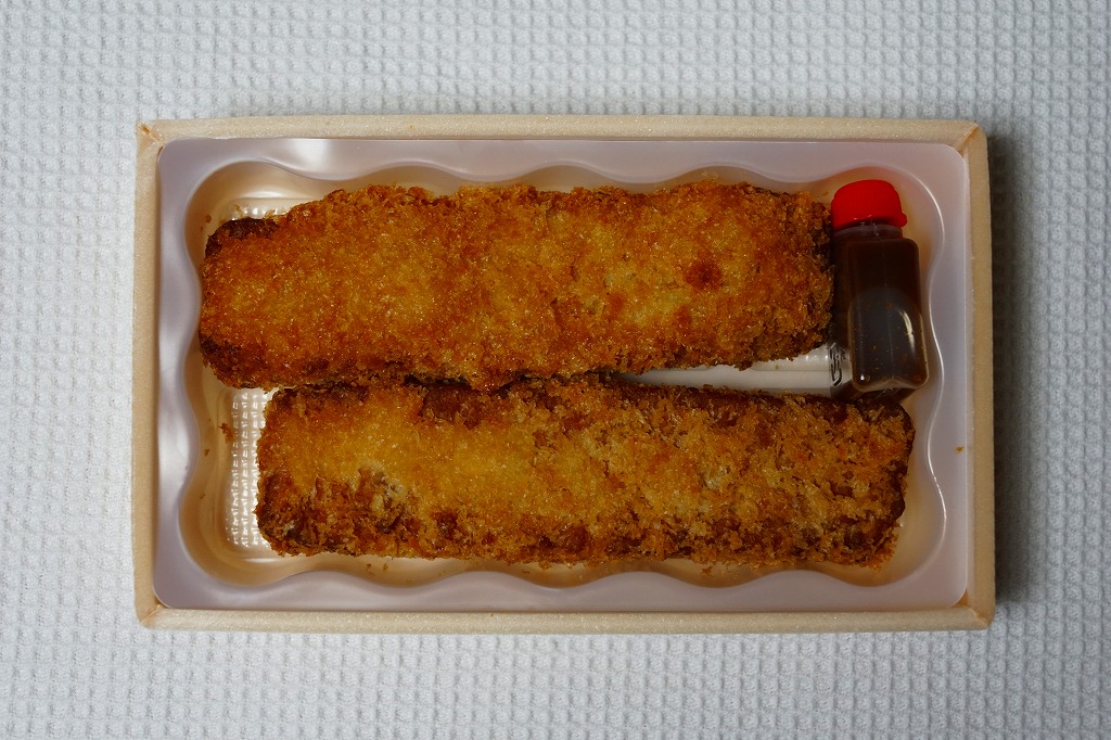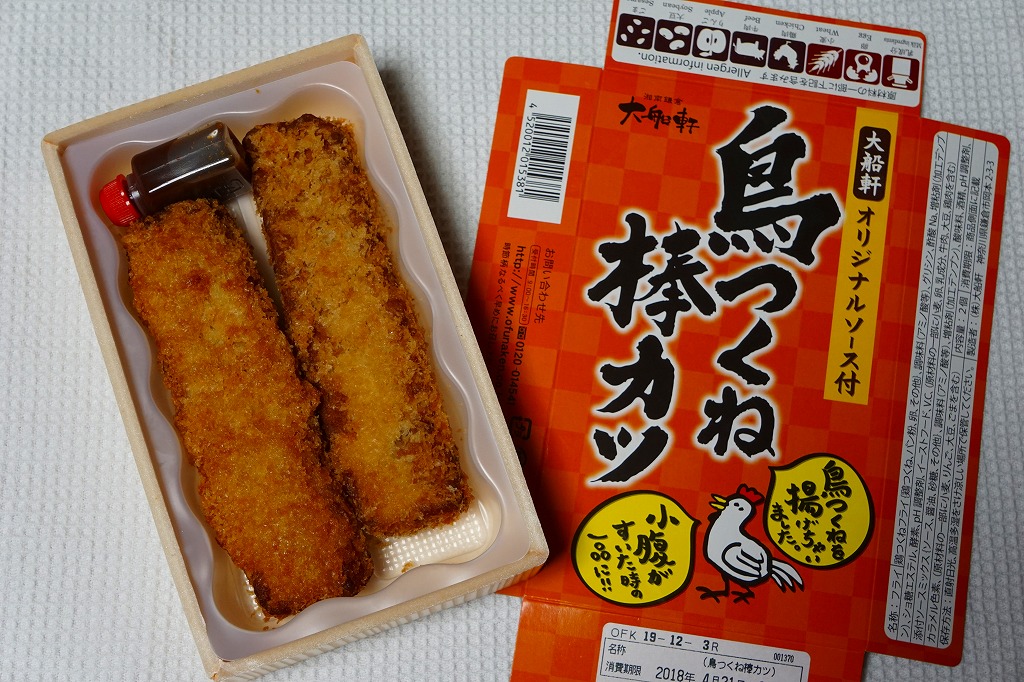 2018(平成30)3月に東京駅の駅弁売店「駅弁屋 祭」で発売か。小箱に収めた半透明のプラ製トレーに、商品名「鳥つくね棒カツ」、食品表示「鶏つくねフライ」なる棒状の鶏つくね揚げを2本入れ、ソースを添える。下記の商品「鳥揚げちゃった」と趣旨は同じで、そのリニューアルではないだろうか。ずいぶんと油っぽい気はしたが、揚げつくねの市販惣菜は初体験。1年間ほどの販売か。