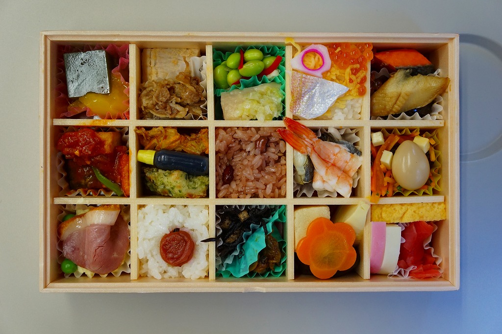 中身は15区画に「3つのお祝ご飯と、30種類の食材を使ったおかず」を詰めたという。内訳は、めで鯛ちらし、赤飯、日の丸ご飯、紅鮭塩焼き、昆布山椒煮、煮穴子、キャロットラベ、スモークチーズ、うずら玉子醤油漬け、玉子焼き、紅白蒲鉾、さくら大根漬、紅白なます、炙り鯵の酢〆、海老酢漬、高野豆腐の煮物、椎茸煮、筍煮、人参煮、蒸し鶏、枝豆梅肉あえ、蒸し鶏ネギ塩ダレ、ひじき煮、あさりの時雨煮、豚みそ漬け焼き、牛肉オイスターソース煮、竹輪磯辺揚げ、しらすかき揚げ、鯖トマトソース煮、厚揚げの素揚げ、アイガモスモーク、ポテトサラダ、緑茶羊かん、マンゴーシラップ漬けと、全34種。まるで青森駅弁「ひとくちだらけ」のような怪作。それでもさすがは東京で、味も見栄えも美しくできている。ただし調製は、神奈川県の大船軒。