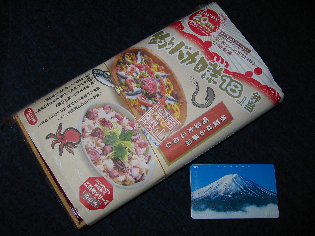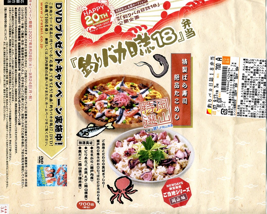 映画「釣りバカ日誌18」の公開に合わせて、2007(平成19)年8月28日から9月24日まで、JR東日本系のコンビニ「NEWDAYS」で売られたコンビニ弁当。中身のイメージ写真に商品名や映画名、プレゼントキャンペーンの案内など情報量の多い掛紙で、ちょっと駅弁っぽい容器を包む。