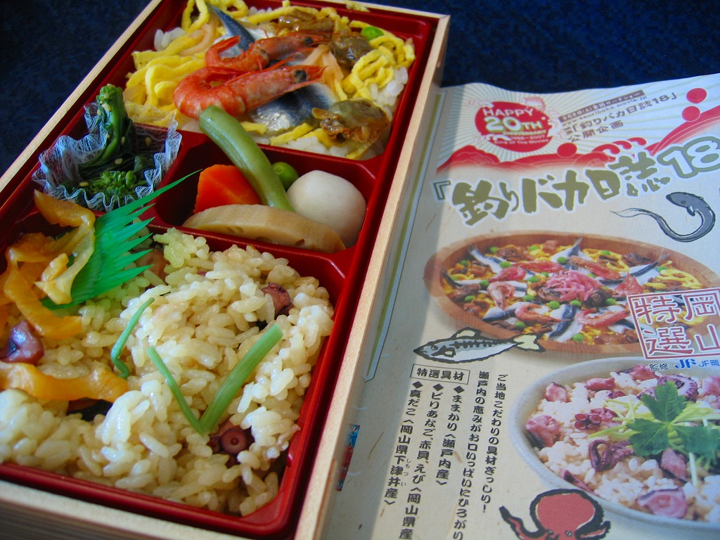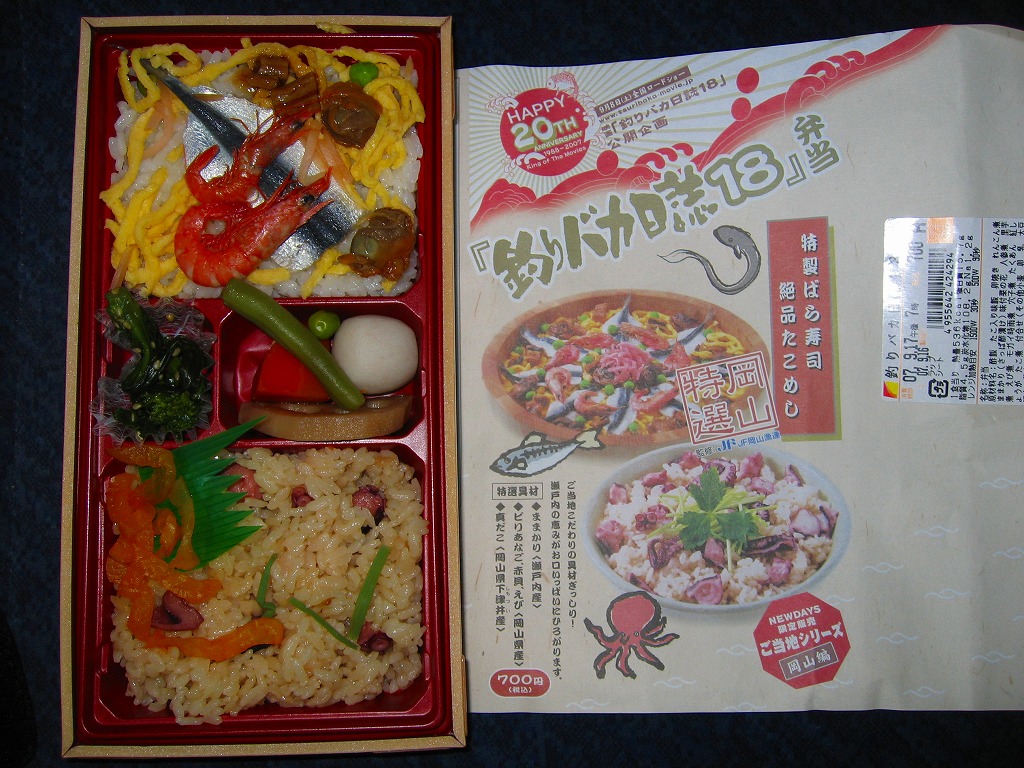 映画のロケ地である岡山にちなんだという中身は、酢飯の上にママカリや海老や赤貝を散らしたばら寿司と、たこめしが入り、煮物や菜の花を付ける。風味は良好、映画の知名度も抜群、しかしこれだけで岡山をPRできたかは、なんともいえない。