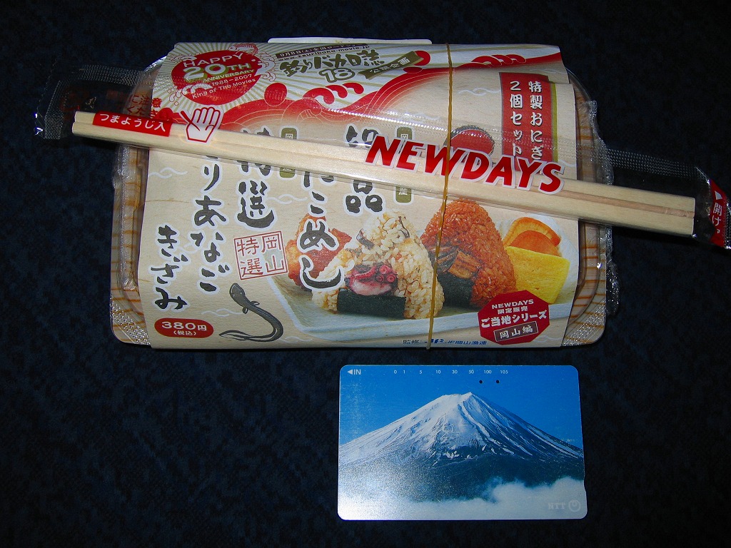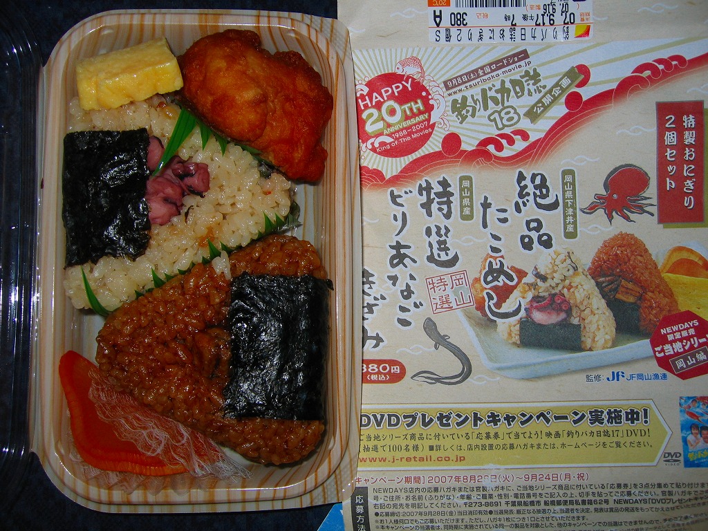 映画のロケ地である岡山にちなんだという中身は、タコ煮付き山菜おにぎりとあなごきざみ付き味飯おにぎりが各1個入り、鶏唐揚と玉子焼とタクアンを付ける。見栄えはやや駅弁っぽいが、風味はコンビニのもの。東日本キヨスク改めJR東日本リテールネットの販売だが、調製はNREの名義になっている。