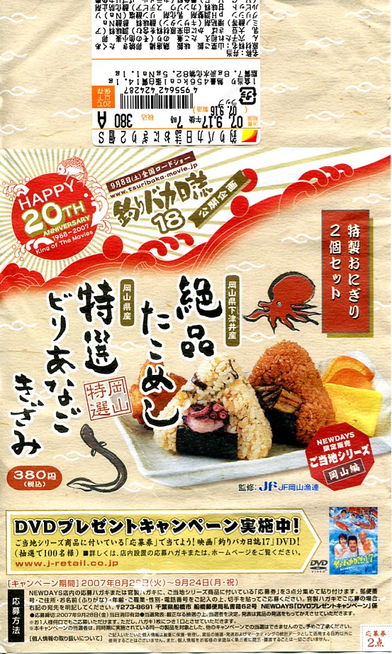 映画「釣りバカ日誌18」の公開に合わせて、2007(平成19)年8月28日から9月24日まで、JR東日本系のコンビニ「NEWDAYS」で売られたおにぎりセット。中身の写真に商品名や映画名、プレゼントキャンペーンの案内など情報量の多い掛紙で、プラ製の惣菜容器を包む。