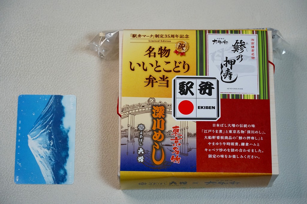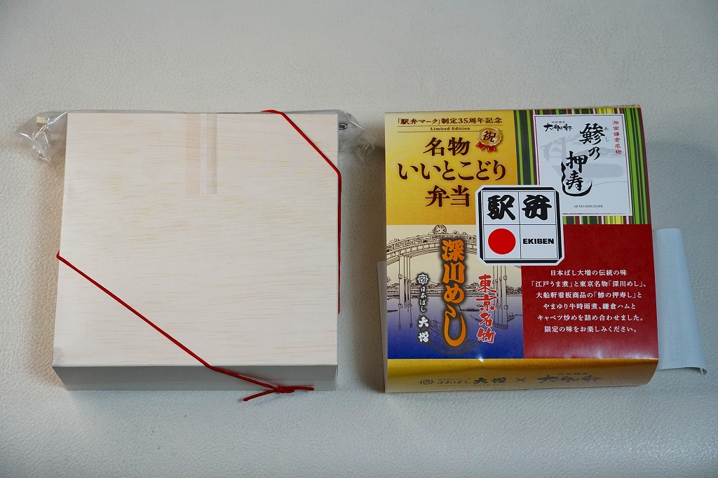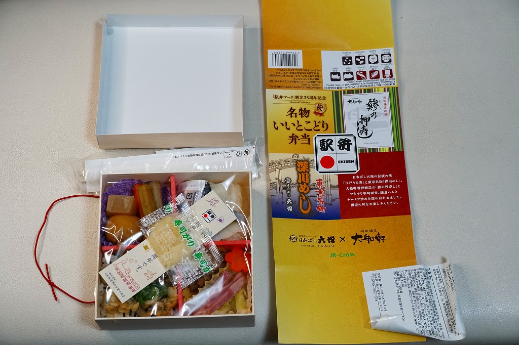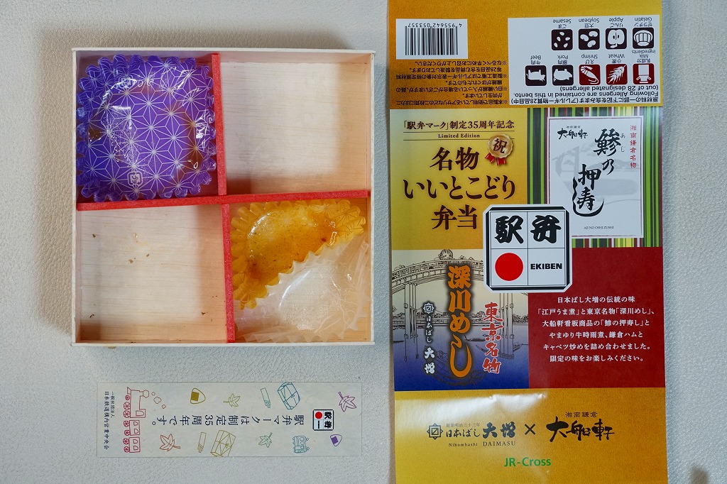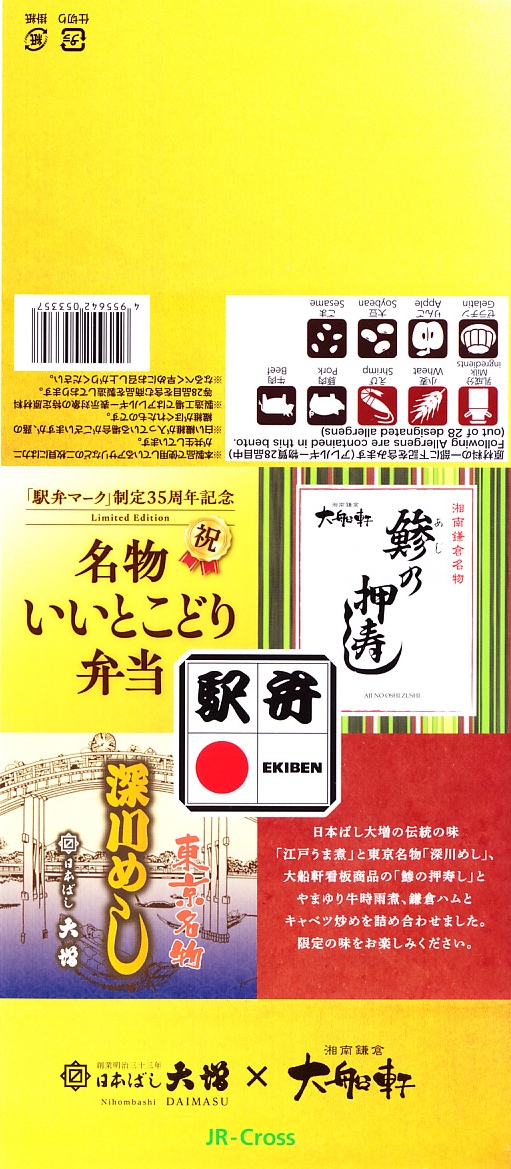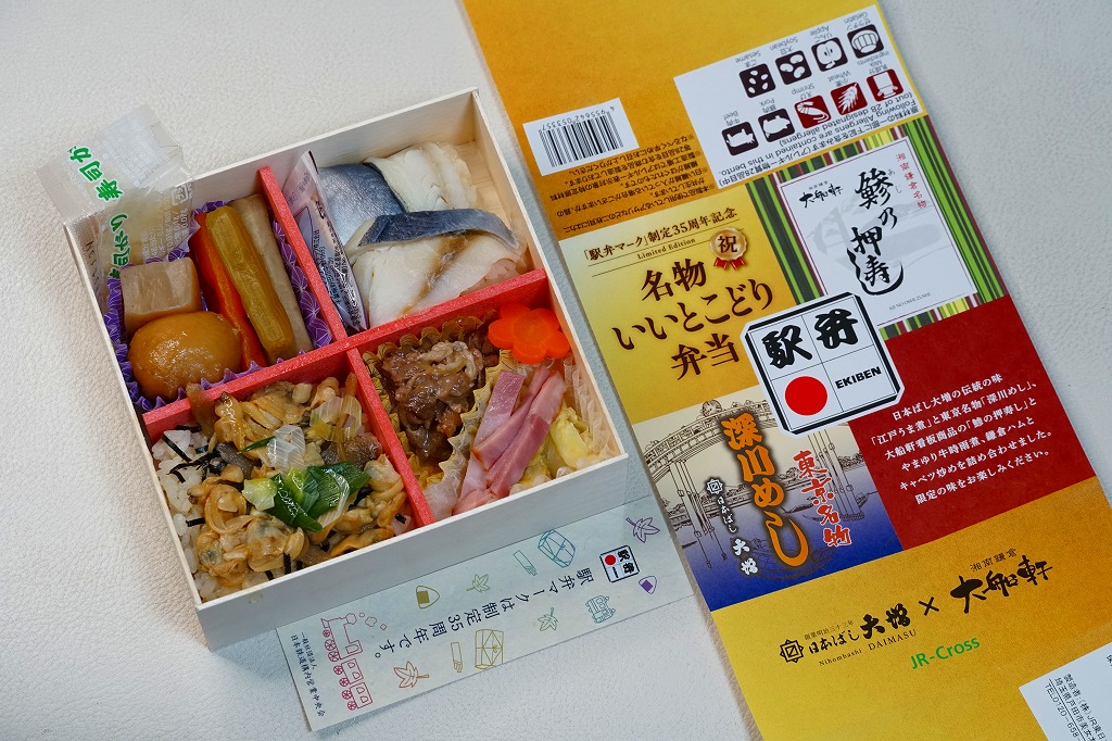 2023(令和5)年11月10日に東京、上野、新宿、大宮、高崎の各駅で発売。日本鉄道構内営業中央会の「駅弁マーク」制定35周年を記念し、会員のうち29社が主に11月10日から期間限定で販売した31種類の記念駅弁のうち、東京駅の駅弁屋のもの。正方形の容器は4区画に仕切られ、日本ばし大増の伝統の味「江戸うま煮」、東京名物「深川めし」、大船軒看板商品の「鯵の押寿し」、やまゆり牛時雨煮と鎌倉ハムとキャベツ炒め。