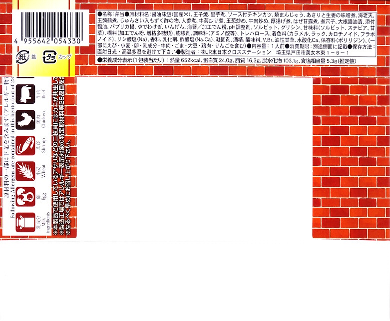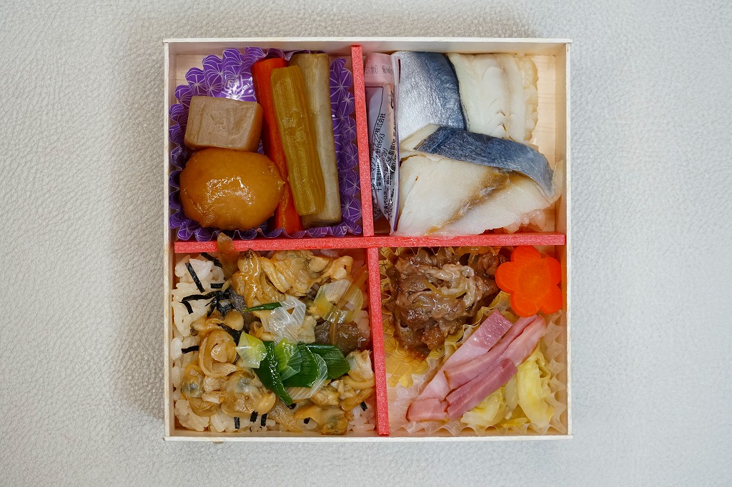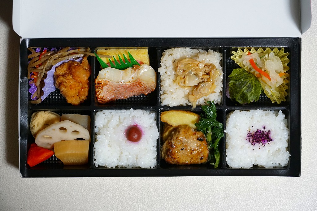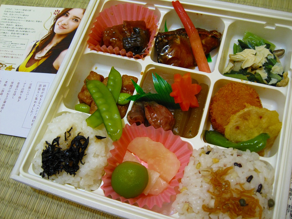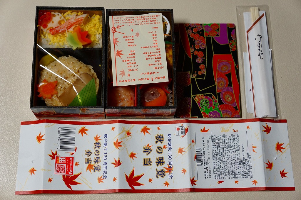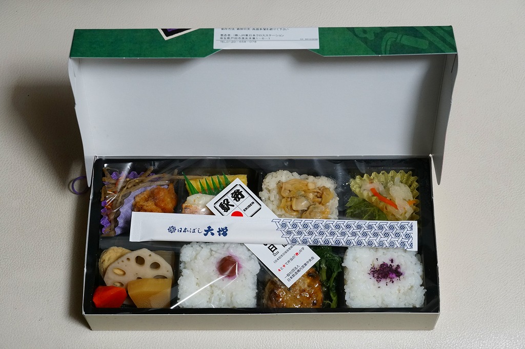 これは日本食堂、日本レストランエンタプライズ、日本ばし大増の時代からの仕出し弁当で、過去に成田空港駅や東京総合車両センターなどで売られた商品「やまびこ」にそっくり。2024年時点でも税込み1,026円で現行の商品について、8区画の中身を少し変えて、カードを添付して記念駅弁にした感じ。中身は日の丸御飯、あさり御飯、ゆかりめし、タケノコやれんこんなどの煮物、赤魚白醤油焼とかまぼこと玉子焼、鶏唐揚ときんぴらごぼう、豚肉ハンバーグとポテトフライと菜の花、切り干し大根サラダと和菓子。