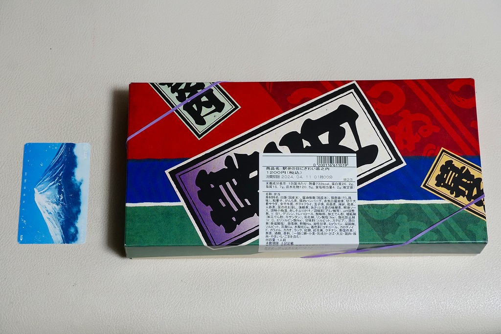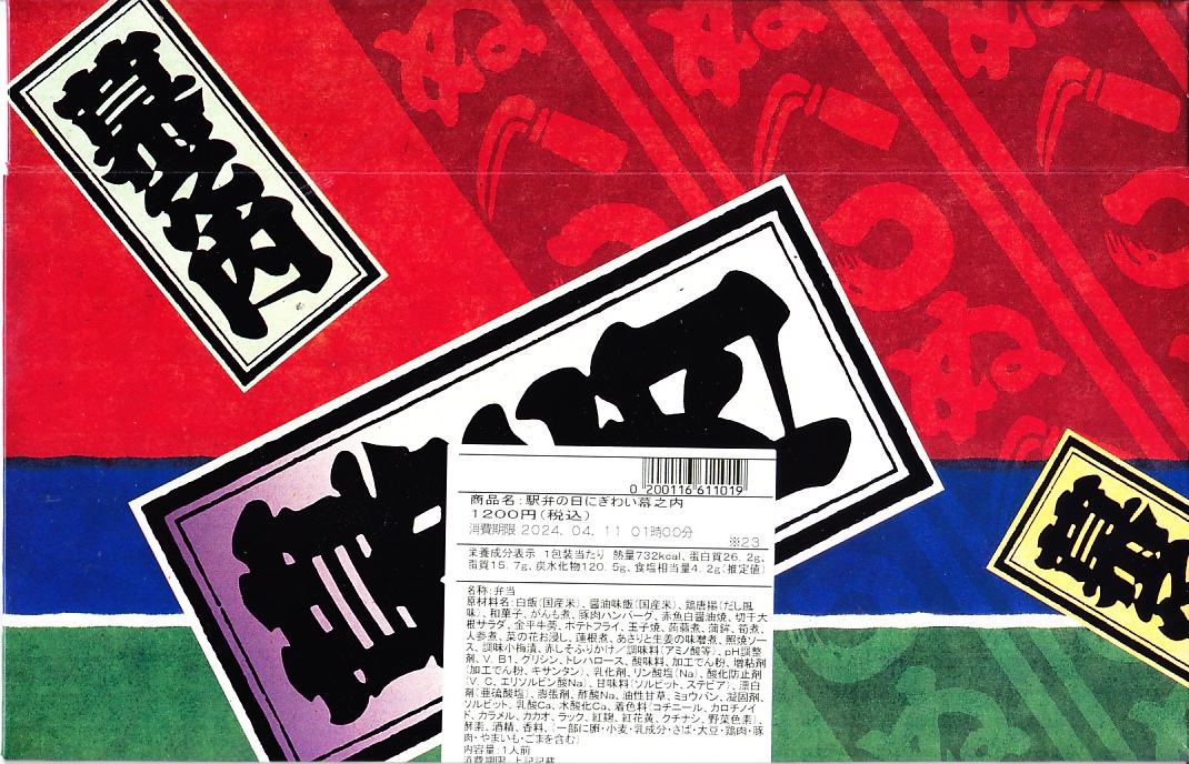 2024(令和6)年4月10日から23日まで、東京駅や新宿駅などで販売。駅弁の日に合わせ、日本鉄道構内営業中央会の会員のうち31社が各社おすすめ駅弁に共通ノベルティ「千社札風カード」を添付して期間限定で販売した駅弁の、東京駅バージョン。駅弁の名前は日本鉄道構内営業中央会のプレスリリースによる。現物には箱で「幕之内」、食品表示で「駅弁の日にぎわい幕の内」と書いてあった。