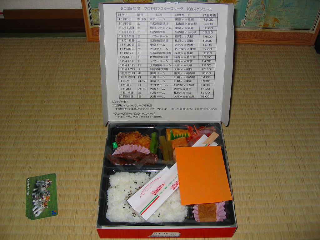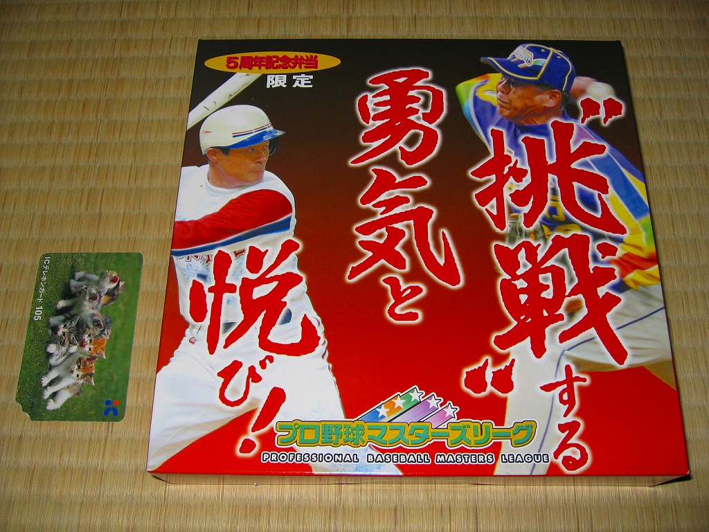 プロ野球マスターズリーグ5周年を記念して、2005(平成17)年11月3日から販売。黒いトレーを入れた正方形のボール紙箱は、フタに村田兆治投手と石毛宏典内野手の写真を載せ、裏ぶたに2005年度の日程表を記す。昭和の食卓をイメージしたという中身は、日の丸御飯に白身魚フライやハムカツ、海老や焼鮭や玉子焼など。日程表が1月22日までなので、その頃までの限定商品と思われる。