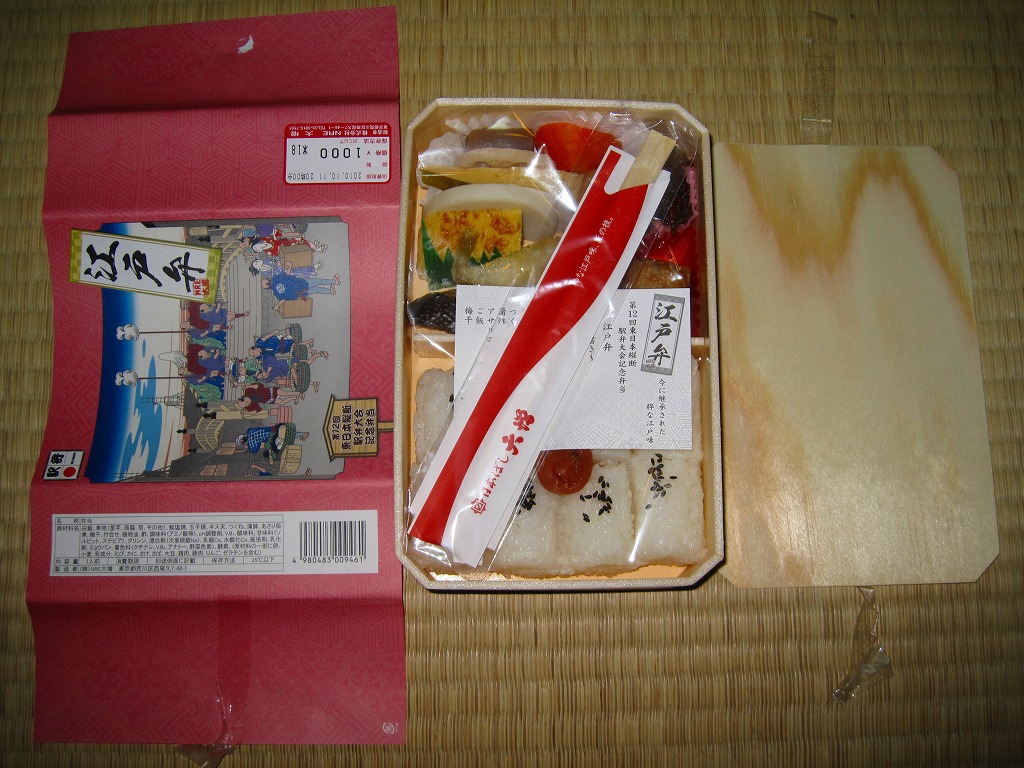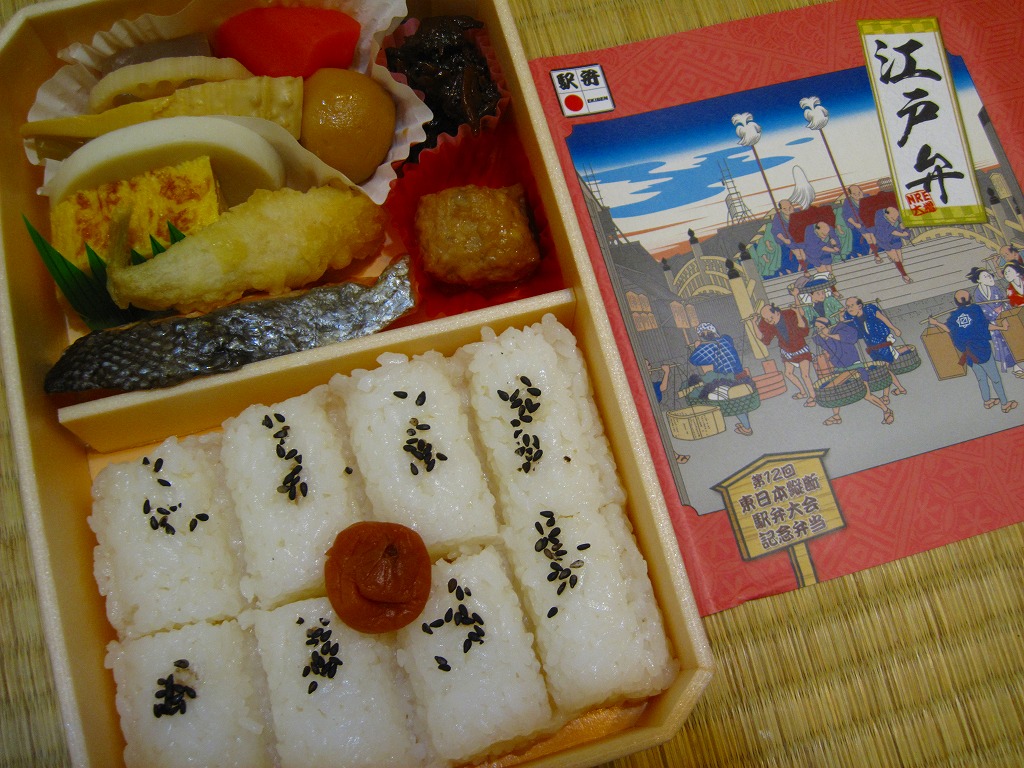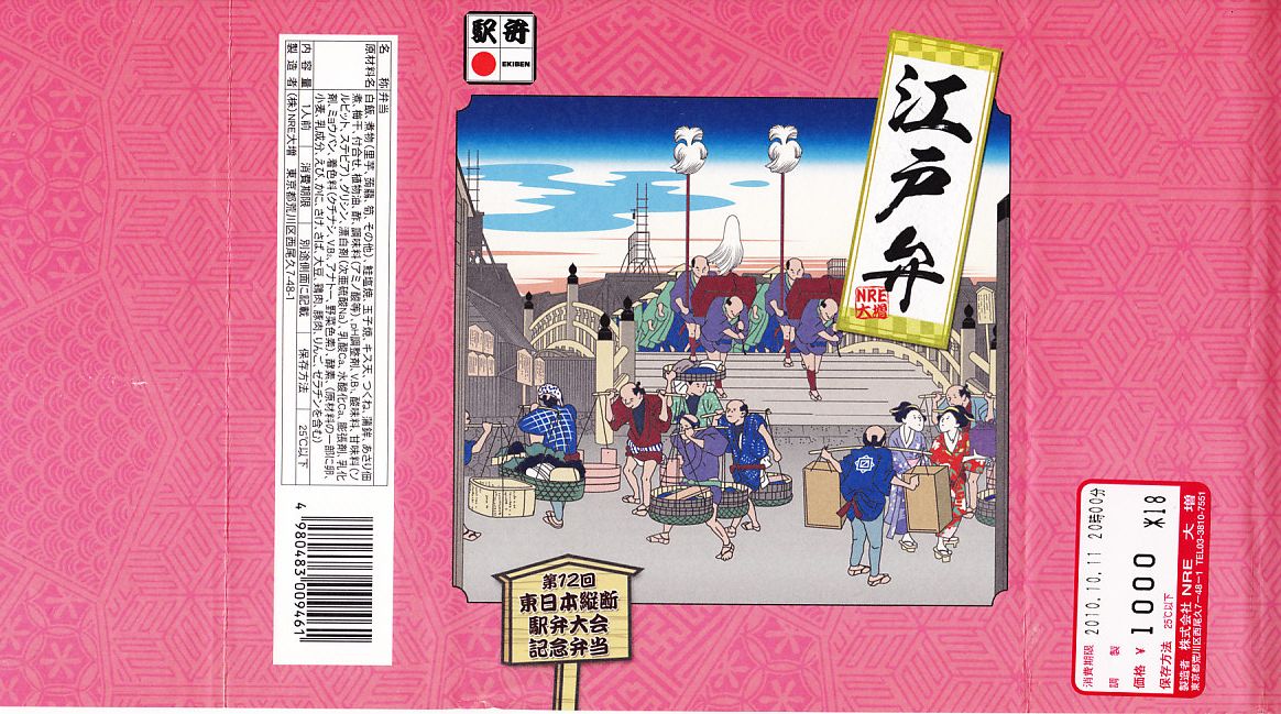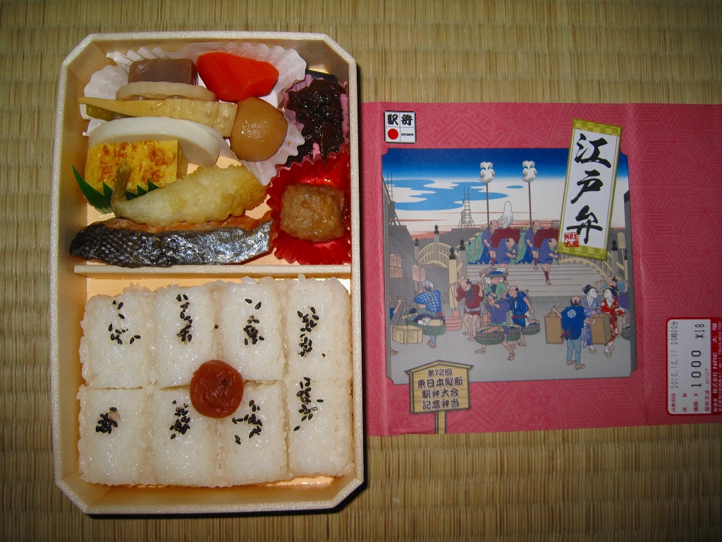 2010(平成22)年10月9日から11日まで東京駅で開催された「第12回東日本縦断駅弁大会」の開催記念駅弁。容器に経木のふたをかけ、江戸時代の錦絵を模して非なる絵柄の掛紙で巻く。中身は日の丸俵飯に焼鮭、かまぼこ、玉子焼、サトイモやニンジンなどの煮物、キス天ぷら、アサリ佃煮。内容こそ確かな幕の内駅弁であるが、掛紙も容器も中身も詰め方も、やっつけ感が先行。御飯の味は良かったのだが、これはどうしてしまったのだろうか。