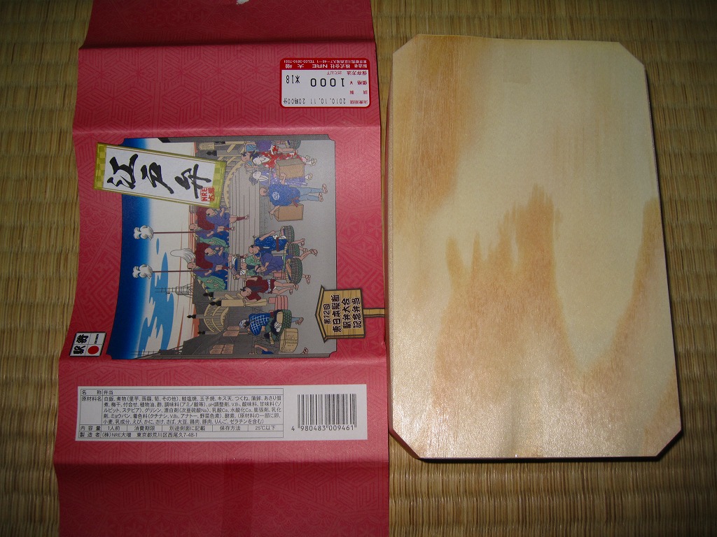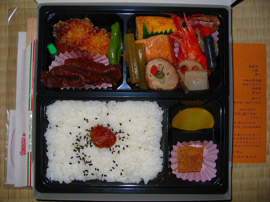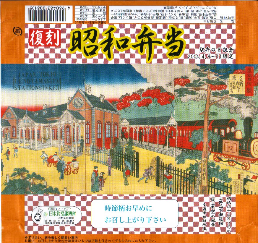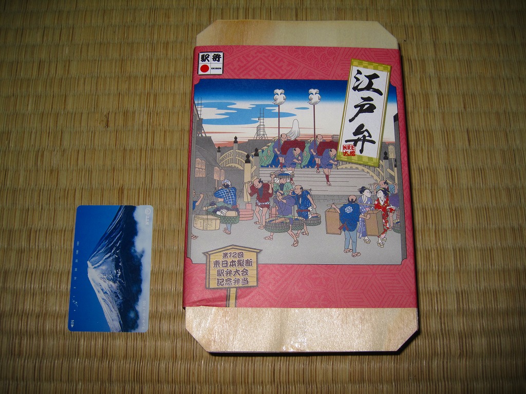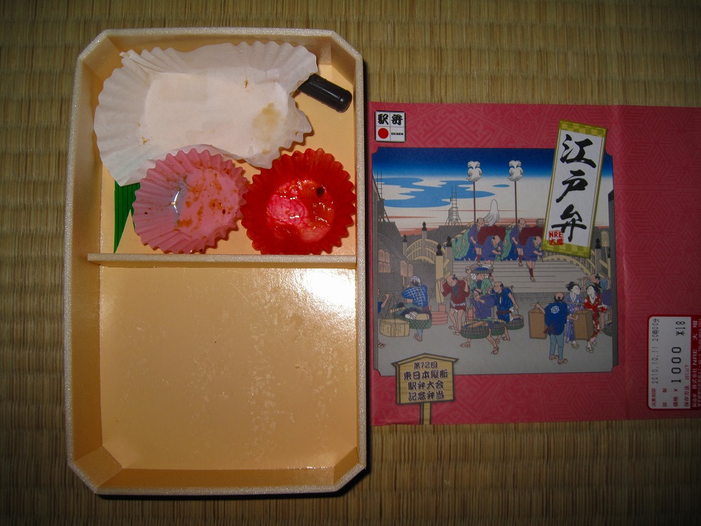 2010(平成22)年10月9日から11日まで東京駅で開催された「第12回東日本縦断駅弁大会」の開催記念駅弁。容器に経木のふたをかけ、江戸時代の錦絵を模して非なる絵柄の掛紙で巻く。中身は日の丸俵飯に焼鮭、かまぼこ、玉子焼、サトイモやニンジンなどの煮物、キス天ぷら、アサリ佃煮。内容こそ確かな幕の内駅弁であるが、掛紙も容器も中身も詰め方も、やっつけ感が先行。御飯の味は良かったのだが、これはどうしてしまったのだろうか。