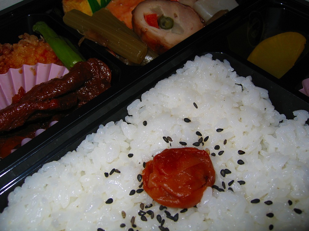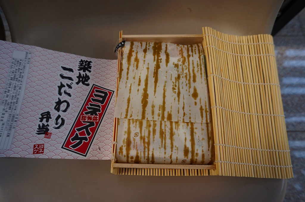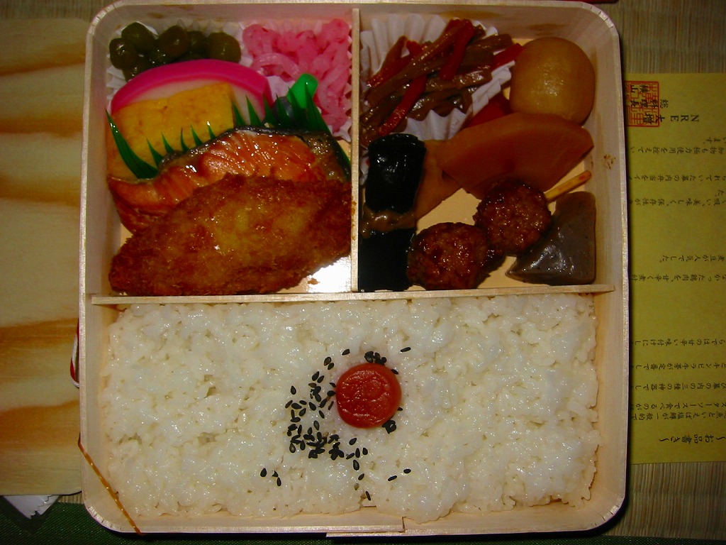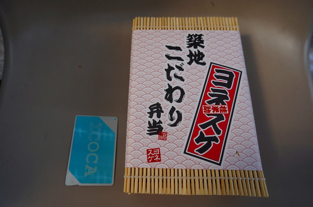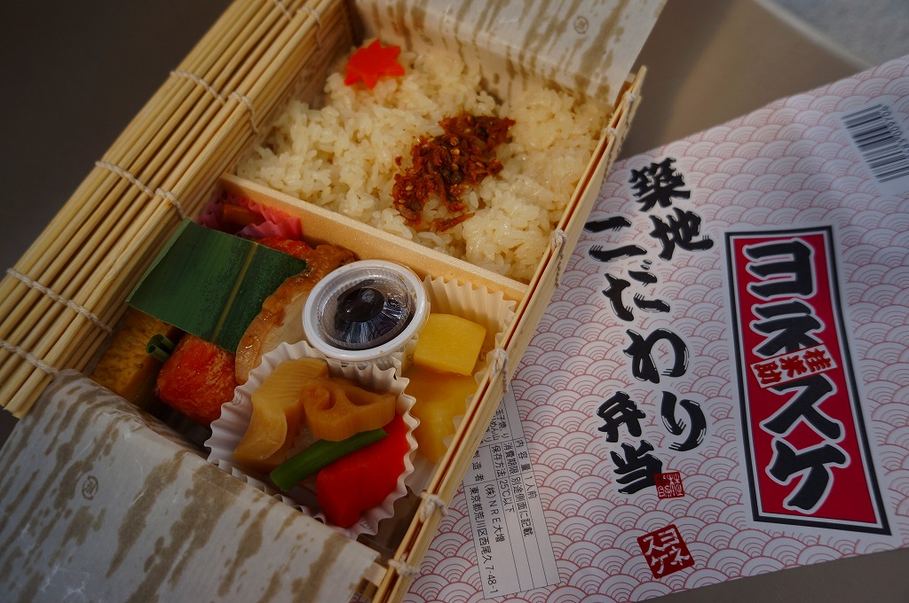 2011(平成23)年10月8日から10日までに東京駅で開催された「第14回東日本縦断駅弁大会」で販売された商品で、ヨネスケこと落語家の桂米助氏のプロデュースによるもの。まきすを用いた容器を、商品名を描いた掛紙で巻く。竹皮柄の紙に包まれた中身は、白おこわ、銀鮭粕漬焼、大山鶏の照焼、丹波黒豆、江戸焼玉子、タケノコやニンジンなどの煮物、りんごシロップ漬など。築地の老舗が詰まるという都会の弁当なのに、見ても食べても内容でも、整然の中に風情が感じられた。