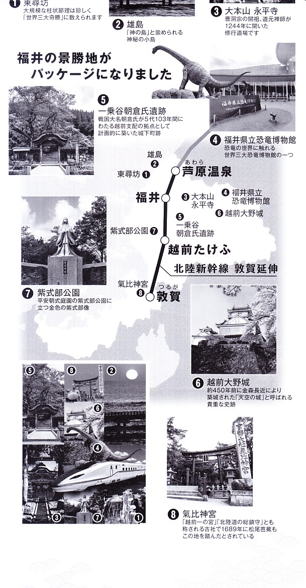 2024(令和6)年3月16日に、東京、新宿、上野、大宮の各駅で発売。同日の北陸新幹線の敦賀駅までの延伸開業を記念したもので、掛紙の絵柄も新幹線電車と路線図と、福井県内の観光名所の写真でできている。掛紙の裏面でも路線図と写真で福井県内の観光名所をアピール。中身は東京駅から福井県への延伸と繋がりをイメージしたとされる、海鮮ちらし寿司、里芋のころ煮と厚揚げの煮たのと菜の花お浸し、羽二重餅とさつまいも旨煮とにしん昆布巻、あとは日本ばし大増の煮物、ひじき煮と鶏照焼。羽二重餅を除き福井にしかないものは無いけれど、商品名と掛紙の絵柄と駅弁売店での大量陳列で、北陸新幹線の延伸開業を東京でアピールした。6月まで販売。