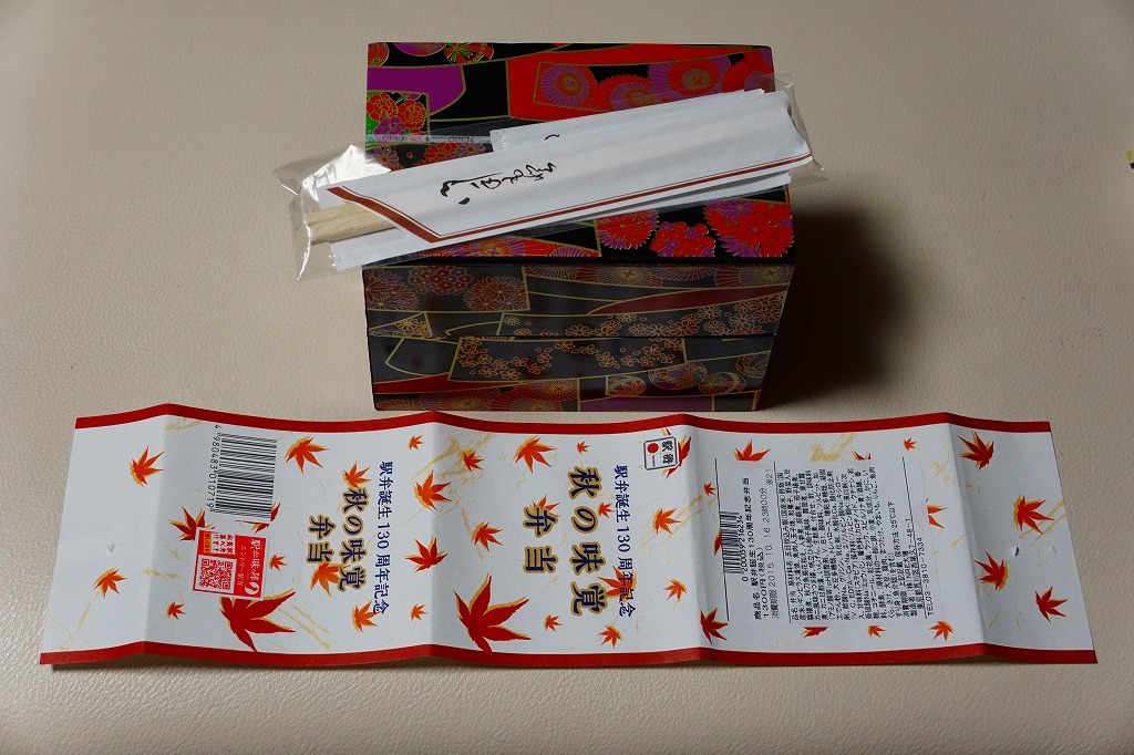 掛紙の絵柄も4区画で、このとおり書いてある。加えて駅弁の名前と記念の文字、「鯵の押寿し」のスリーブの絵柄、「深川めし」のふたの絵柄、日本ばし大増と大船軒のロゴマークと駅弁マークも記す。JR東日本クロスステーションが吸収した各社で長らく売られた駅弁の、いいとこがとりいれられた、駅弁ファンが感心しそうな記念駅弁。これは11月10日から1月中旬までの販売。