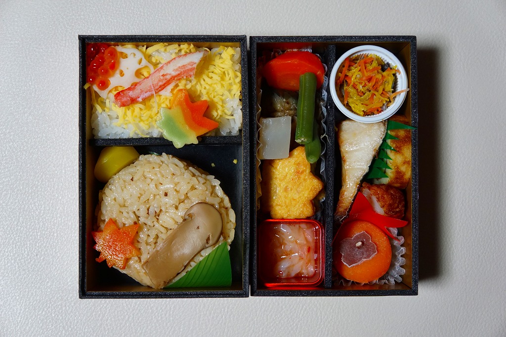 添付のおしながきでも紹介される中身は、「壱の重」こと上段に銀ひらす漬焼、サンマ菊花和え、薩摩揚、マイタケやナスなどの煮物、柿型の和菓子など、「弐の重」こと下段に、マツタケを貼る五目御飯と、カニやイクラなどのちらし寿司。
