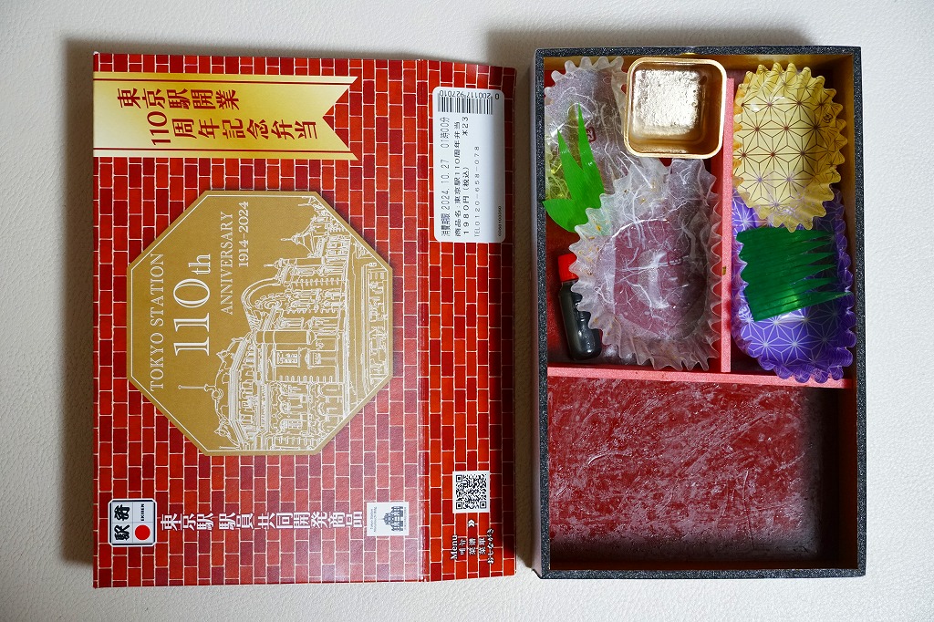 2024(令和6)年10月18日に東京、新宿、上野、大宮の各駅で発売、12月まで販売の予定。その名のとおり、東京駅の開業110周年を記念した弁当。ふたの絵柄は東京駅のイメージどおりの丸の内駅舎と赤レンガ。中身は東京駅とJR東日本エリアの新幹線終着駅のある県にちなんだといい、記念焼印入り玉子焼、東京の深川めし、はぜ甘露煮、煮穴子、酒悦のつぼ漬、海老天ぷらなどと、福井のチキンソースカツ、厚揚げの煮たの、里芋ころ煮などと、青森の牛バラ肉玉葱炒め、秋田のじゅんさい入りもずく酢、新潟の笹団子風焼まんじゅう、山形の玉こんにゃく。見た目でも食べても、中身がぎっしり賑やか。