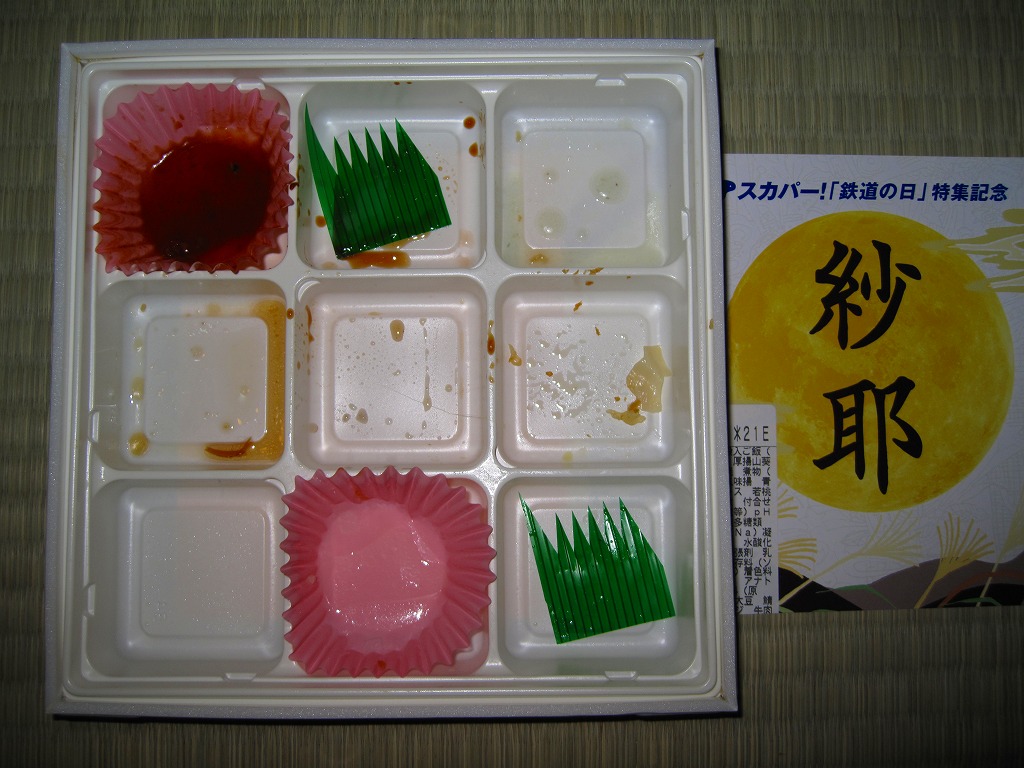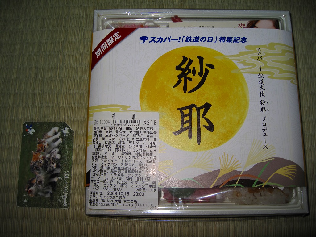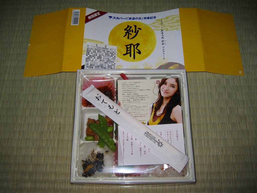 9区画の中身はじゃこ載せ雑穀飯、ひじき載せ白飯、ブリ照焼、とうふハンバーグ、青菜のおひたし、厚揚げ、こんにゃくなどの煮物と砂肝、ホタテ風味揚とレンコン天、桃シロップ漬など。駅弁の名前になった「スカパー!鉄道大使」でファッションモデルの紗耶が好きな食材を集めたそうで、個々の味はNREがしっかり作ったが、見栄えでも内容でもコンセプトがまるで感じられないので、モデルのファンでないと感心できる点が探せないかも。その点で価格にも割高感があった。