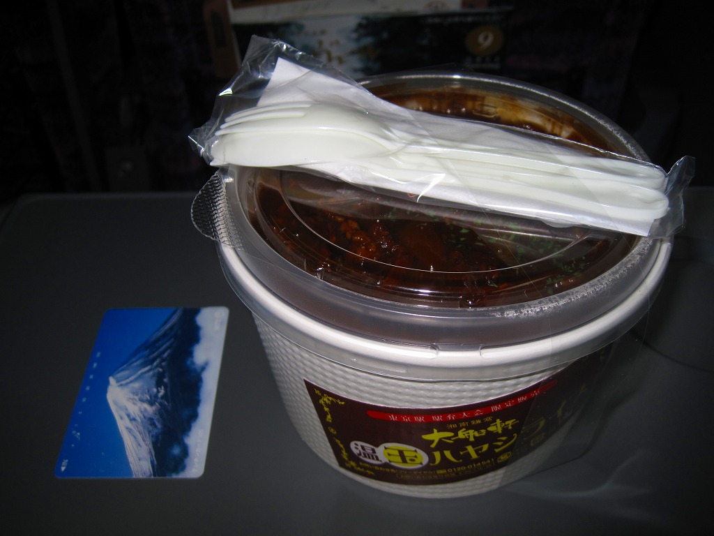 2011(平成23)年9月17日から25日まで東京駅で開催された「東北応援駅弁大会」で販売された商品。中身は商品名どおりの温泉玉子付きハヤシライスで、耐水紙製のカップに白御飯を敷き、半熟卵と福神漬をプラ製ミニカップで詰め、その上に牛肉とタマネギを混ぜたデミグラスソースを詰めた透明なふたをしたもの。