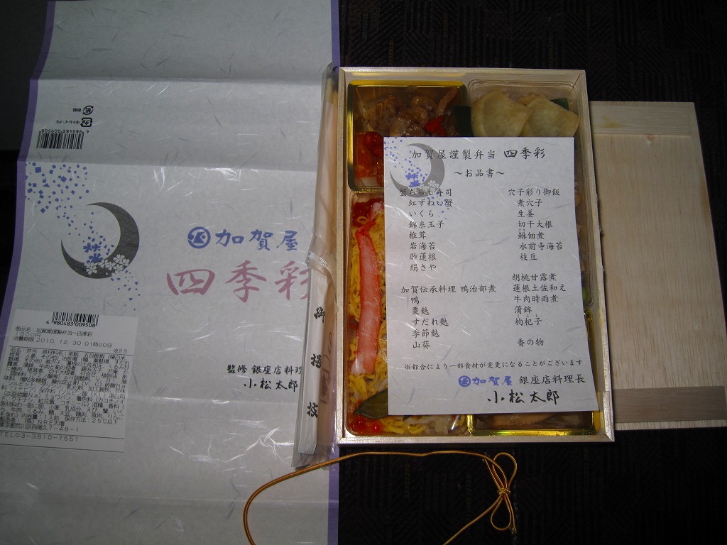 東北新幹線新青森開業に合わせた、2010(平成22)年12月4日の東京駅構内食品街「グランスタダイニング」内「ニッポンの駅弁」の開業に伴い、同日にオープニングスタッフとして発売か。調製元は金沢駅弁の大友楼であるが、ここでは駅弁屋ではなく加賀料理屋として紹介されている。