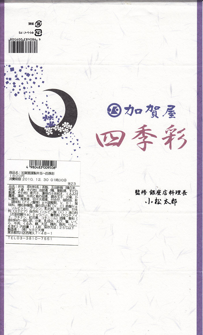 東北新幹線新青森開業に合わせた、2010(平成22)年12月4日の東京駅構内食品街「グランスタダイニング」内「ニッポンの駅弁」の開業に伴い、同日にオープニングスタッフとして発売か。石川県和倉温泉で業界人アンケート31年連続第1位の温泉旅館が東名阪の三大都市圏で展開するレストランのブランドを名乗り、調製元はNRE大増。