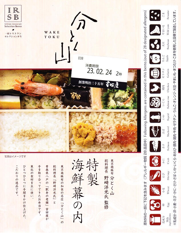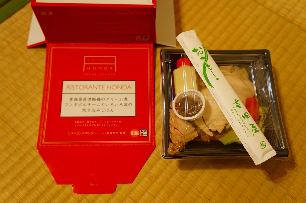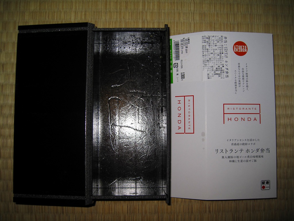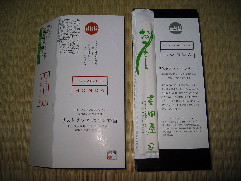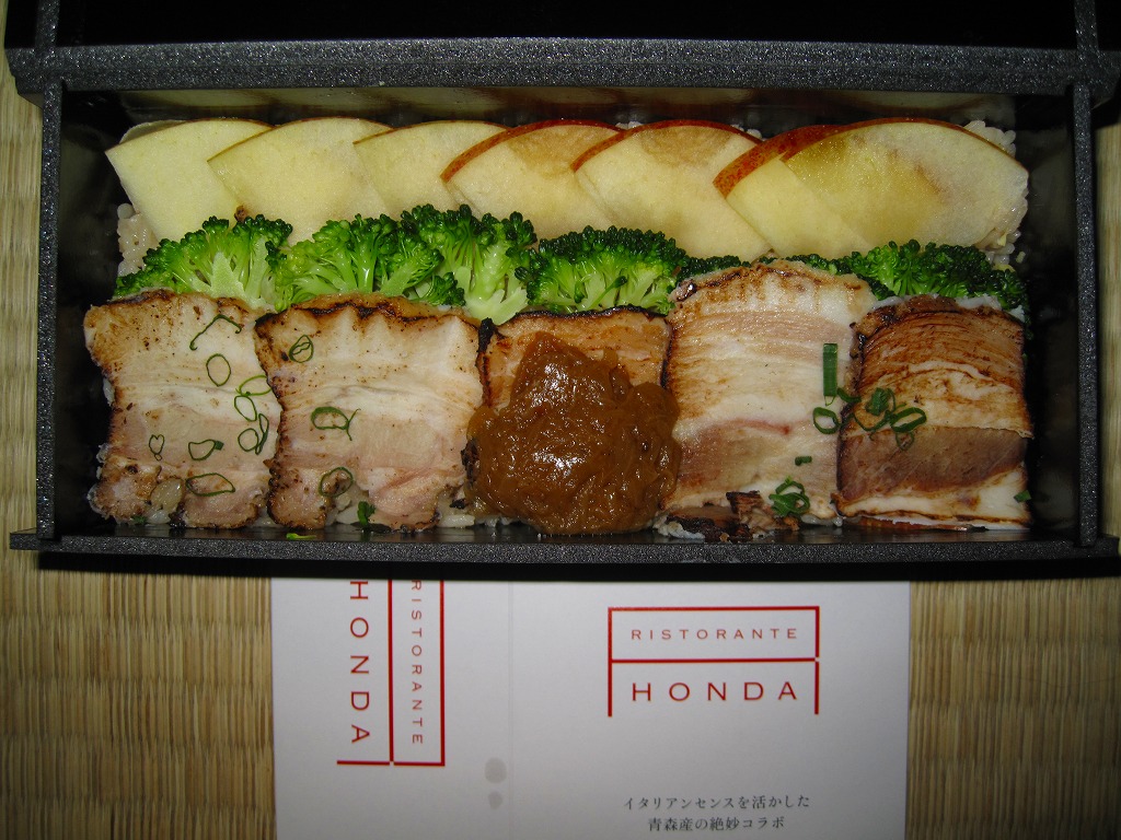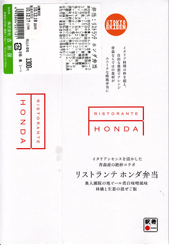 2012(平成24)年4月までに発売か。調製元は下記の商品「リストランテホンダ弁当」ともども、八戸駅弁の吉田屋。グランスタにもたくさんあるデパ地下タイプの高級惣菜弁当で使われているような容器を、ブランド名や商品名を書いた赤い紙箱に収める。