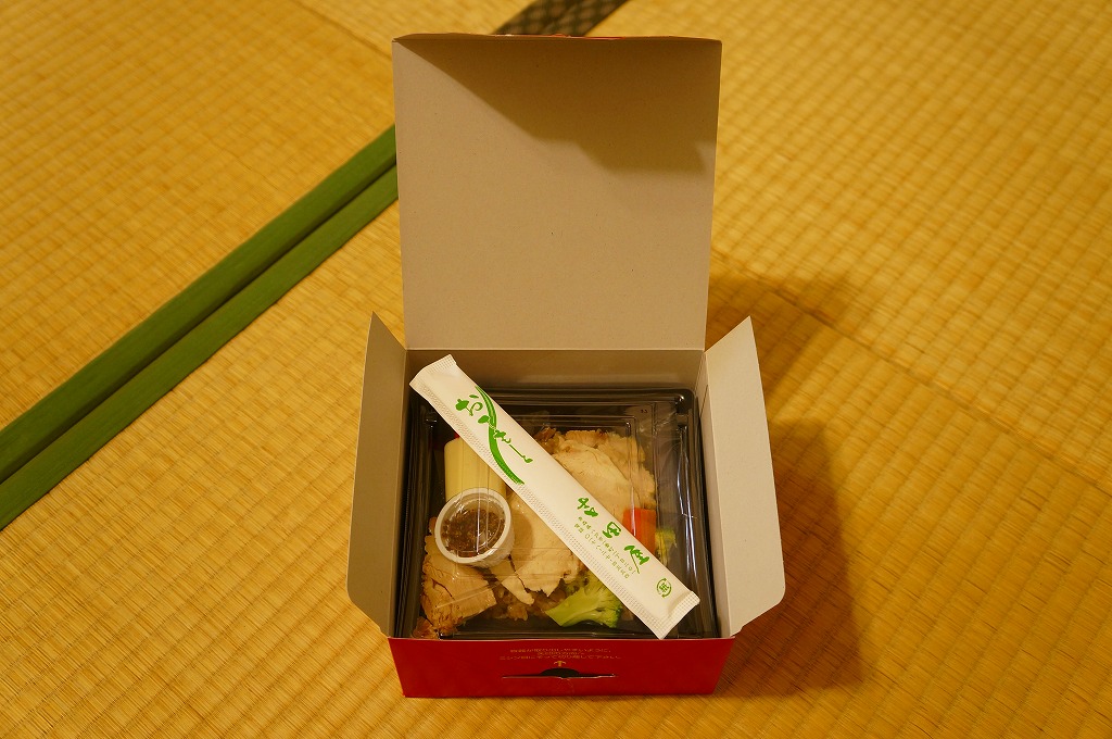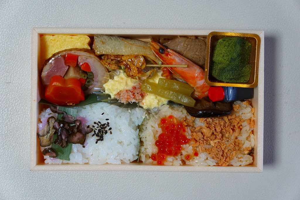 枠は木を使う木製風の長方形の容器に、ブランド名、弁当名、監修者名を記した和紙風の掛紙を巻く。薄手のプラ製トレー4つに収まる中身はそれぞれ、べにズワイガニのちらし寿司、カモの治部煮、アナゴ御飯、牛肉しぐれ煮やカマボコなど。
