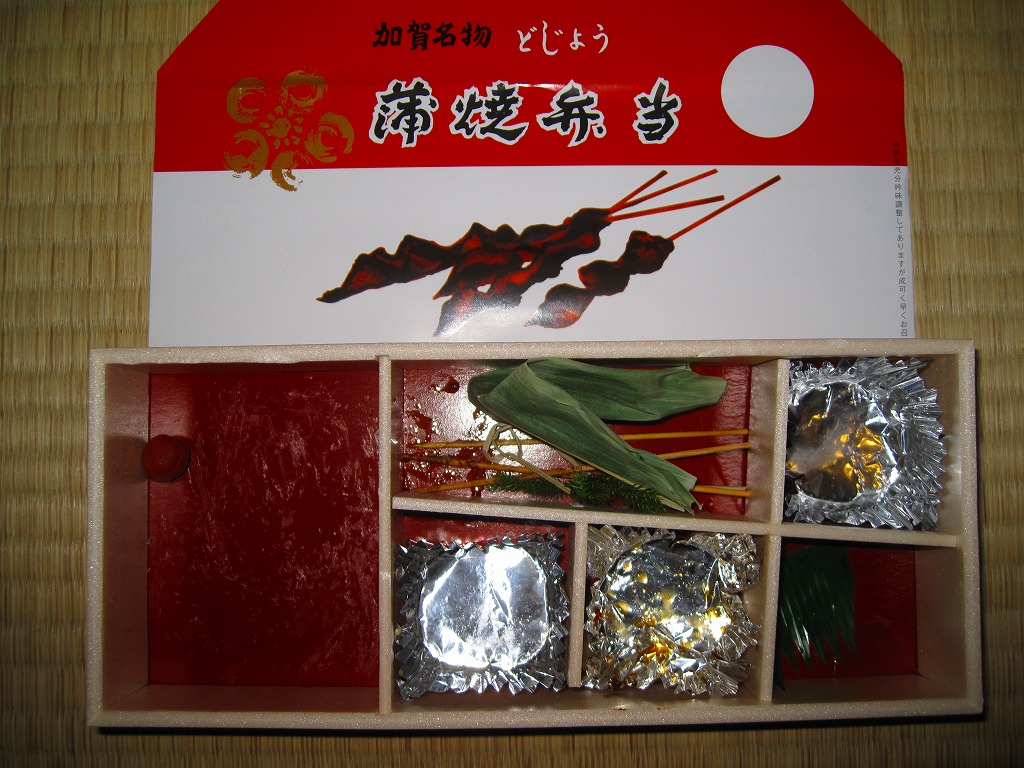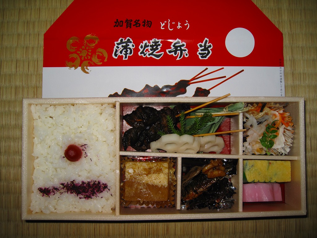 正方形の容器に、駅弁の名前と各種の野菜を描いた、容器に比して小さな正方形の掛紙をかける。8区画に分けて詰められた中身は、白御飯、金時饅頭、ふろふき大根、治部煮、豚肉すき焼風、ウナギ蓮蒸し、玉子焼と梅型のかまぼこと笹麩、フナ甘露煮とクルミ。
