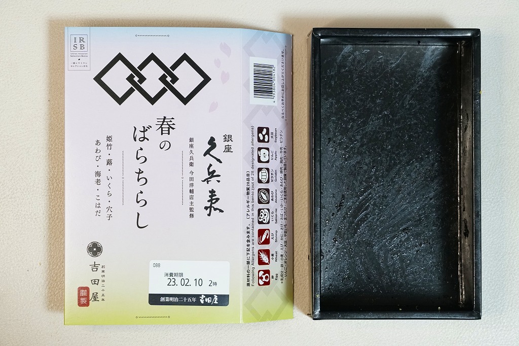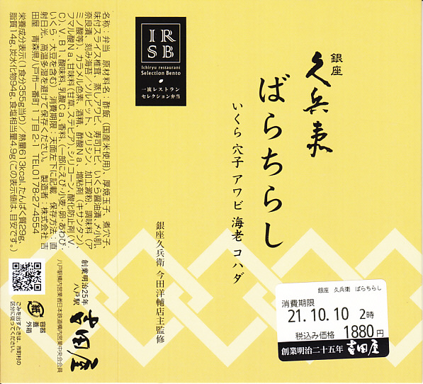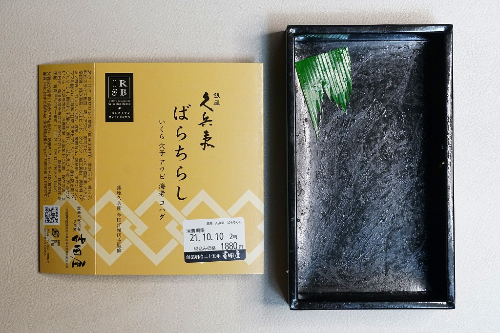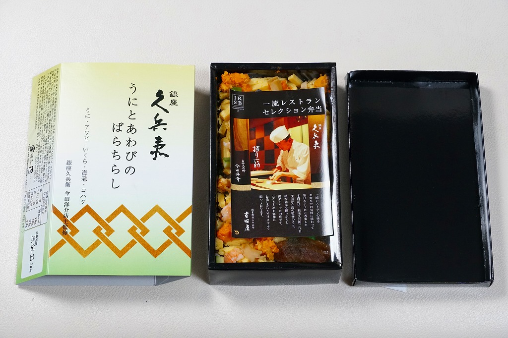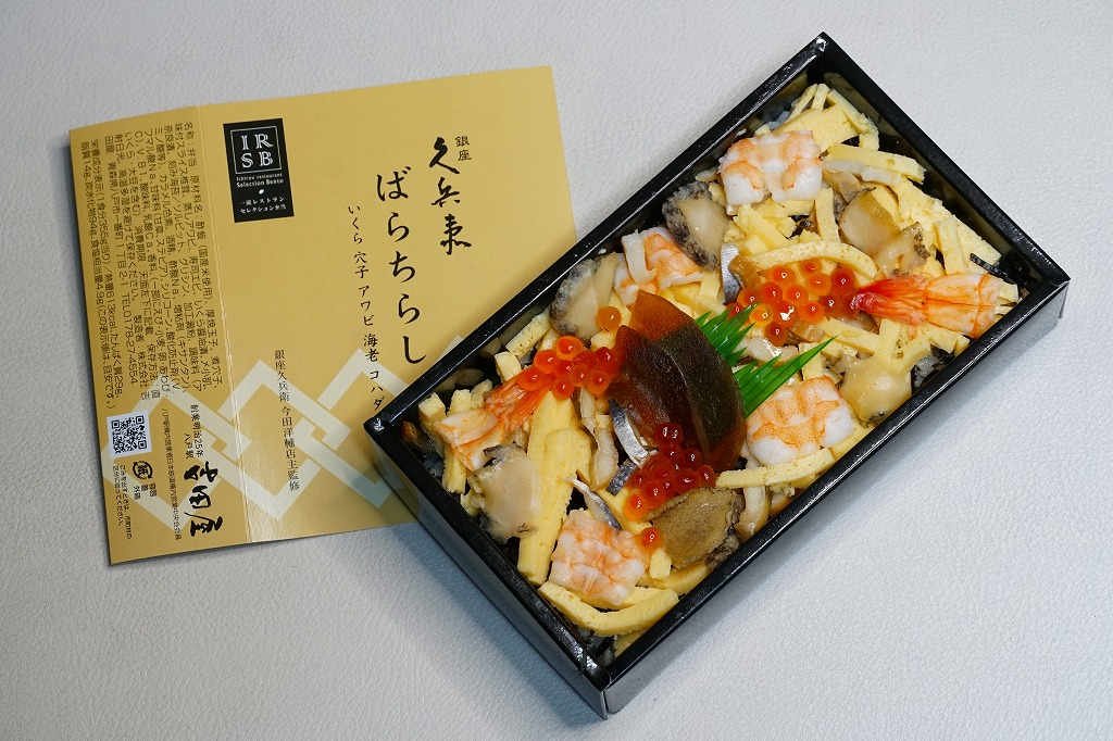 2023年か2024年の発売か。駅では2021年から売られた弁当「銀座久兵衛ばらちらし」シリーズのひとつ。「銀座久兵衛 今田洋介店主監修」として、スリーブと黒い紙容器にその名やロゴを記し、酢飯の上にうに、アワビ、いくら、海老、コハダと、玉子焼、しいたけ、きゅうり、刻み海苔、大葉を散らして、奈良漬けを添える。駅では売られていないが、こうして調製元の店舗で買えるほか、一部の高級スーパーに卸されているらしい。東京駅の駅弁売店「駅弁屋 祭」での復活は、あるかどうか。