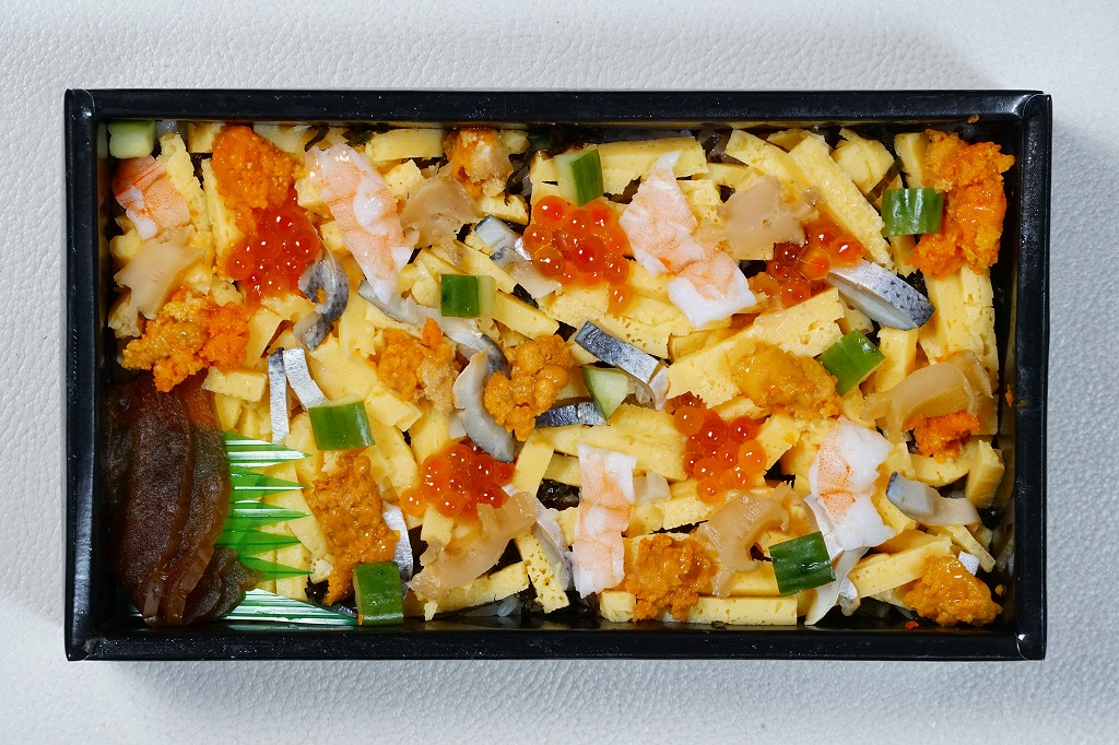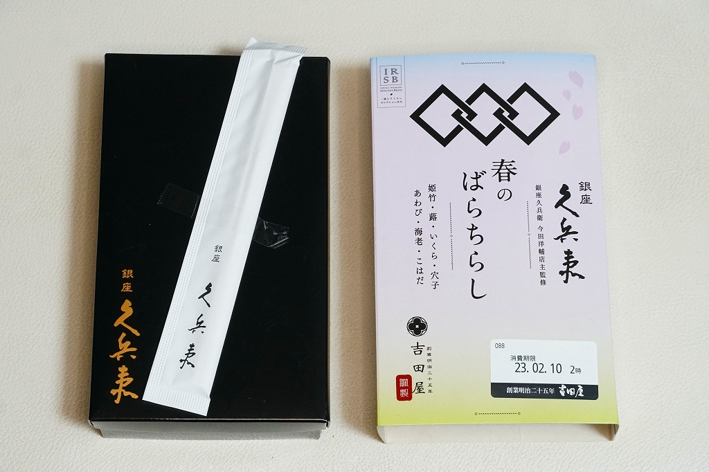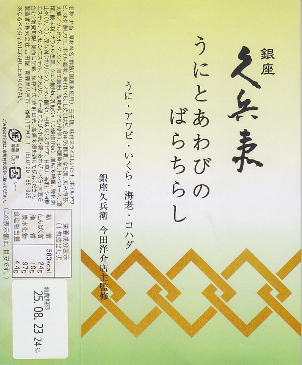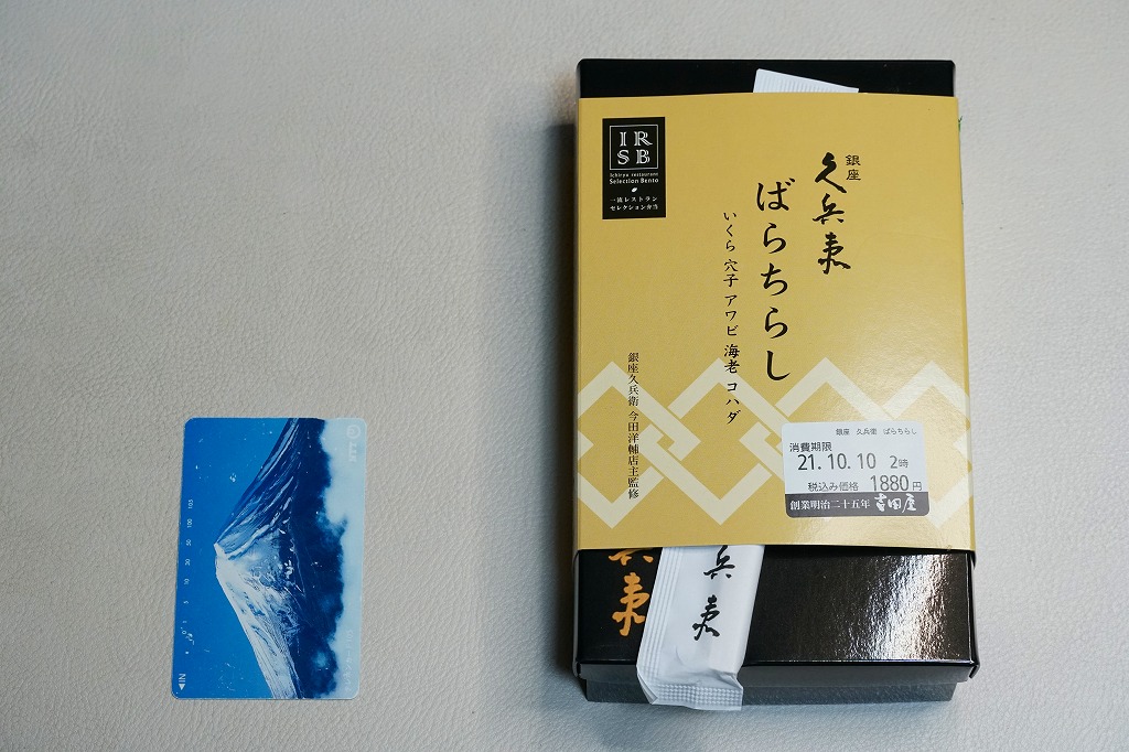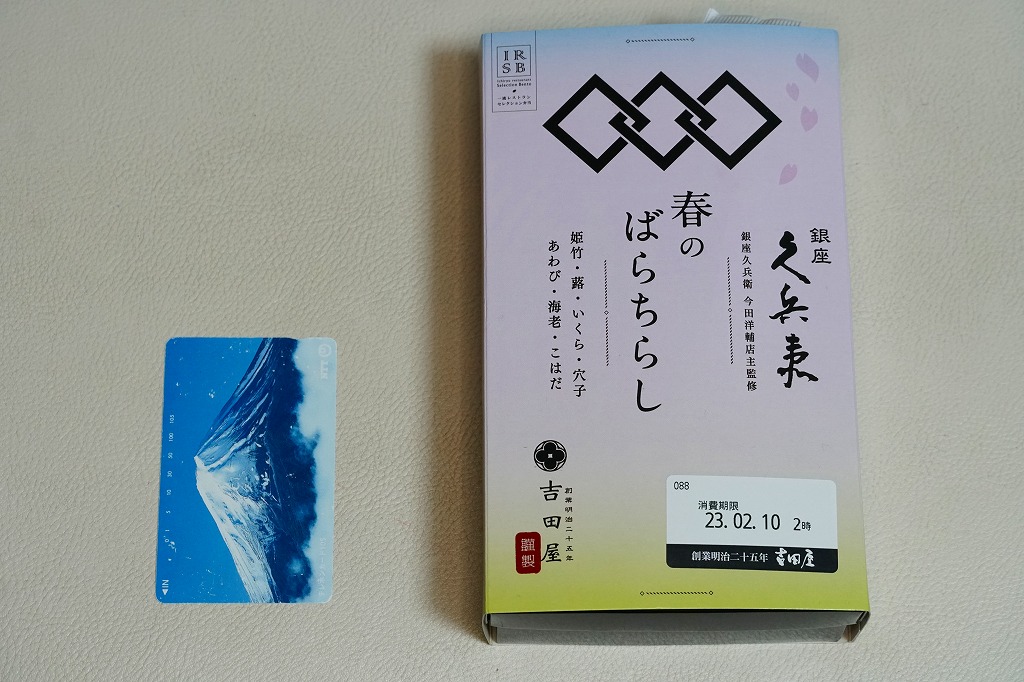 2023年か2024年の発売か。駅では2021年から売られた弁当「銀座久兵衛ばらちらし」シリーズのひとつ。「銀座久兵衛 今田洋介店主監修」として、スリーブと黒い紙容器にその名やロゴを記し、酢飯の上にうに、アワビ、いくら、海老、コハダと、玉子焼、しいたけ、きゅうり、刻み海苔、大葉を散らして、奈良漬けを添える。駅では売られていないが、こうして調製元の店舗で買えるほか、一部の高級スーパーに卸されているらしい。東京駅の駅弁売店「駅弁屋 祭」での復活は、あるかどうか。