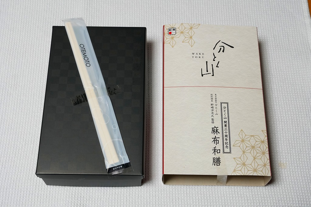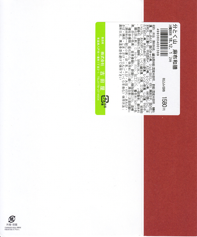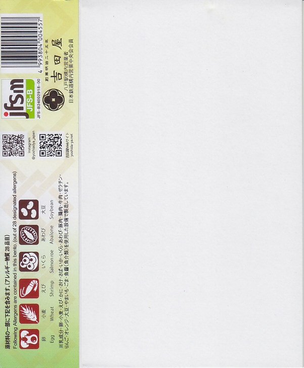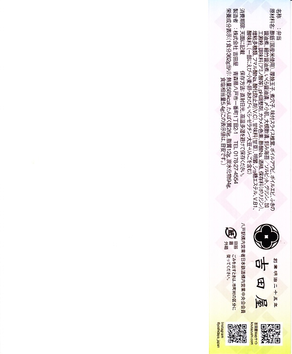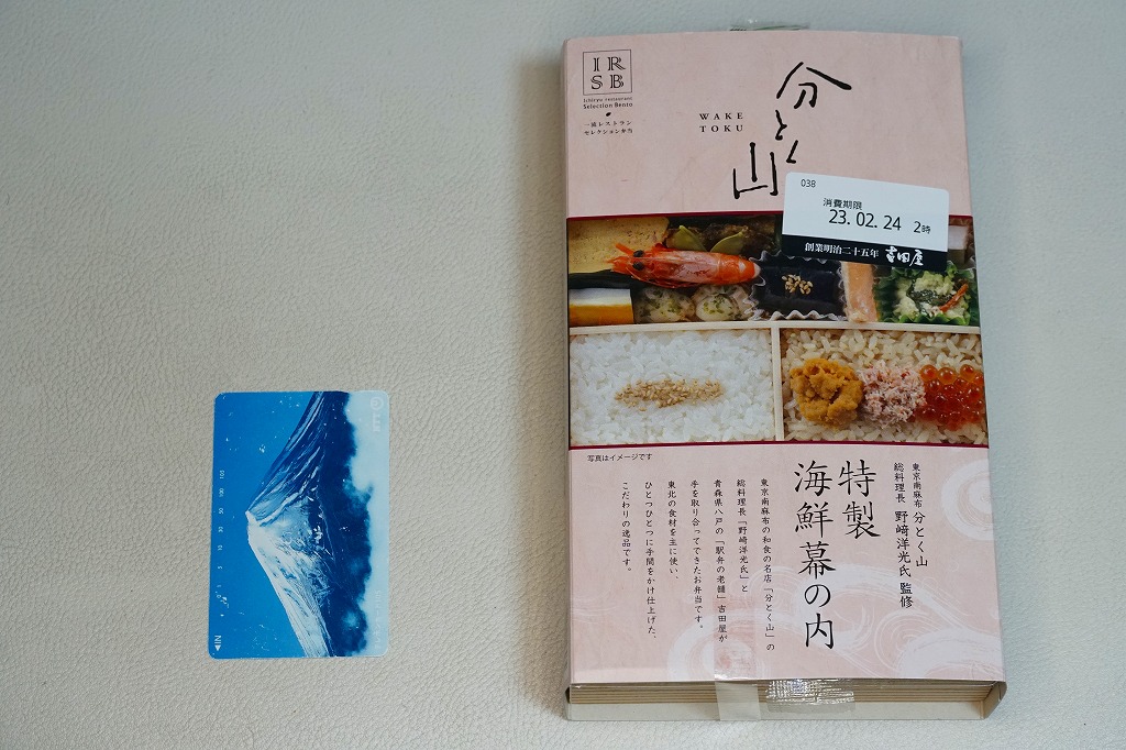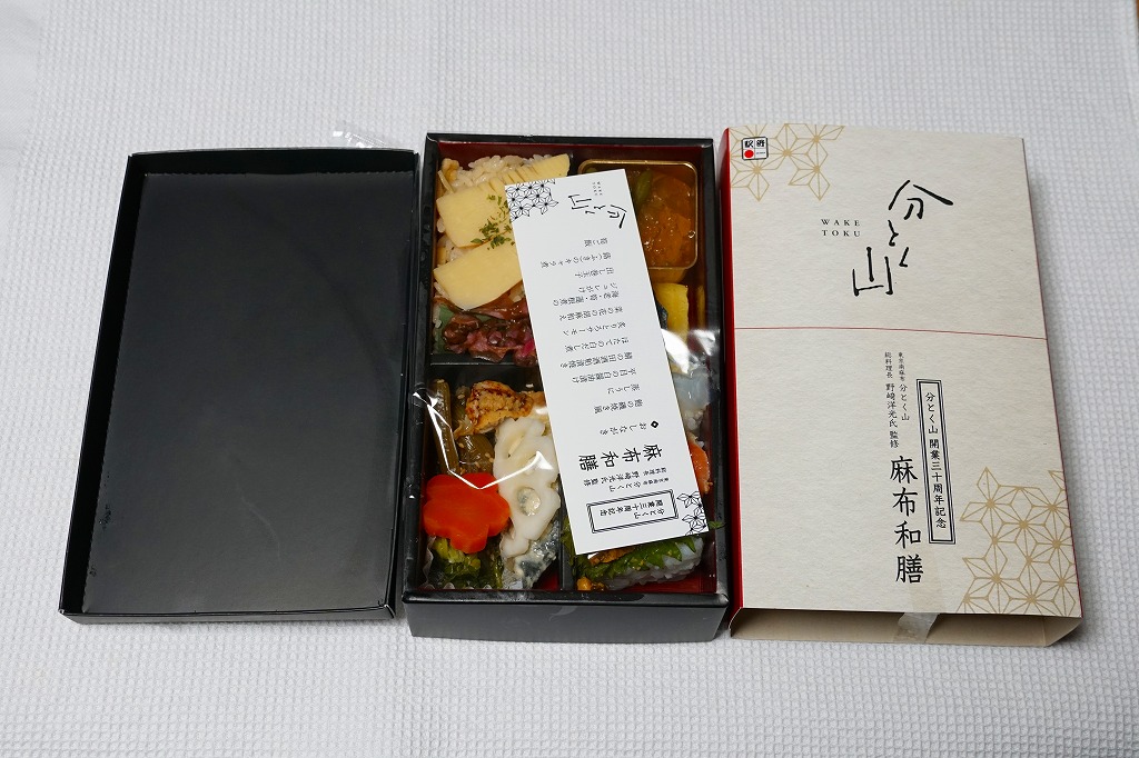 この姿ではいつ出てきたか不詳。2016(平成28)年の2月か3月に事実上東京駅から新宿駅へ移転した「ニッポンの駅弁」に加え、新宿駅の駅弁売店「駅弁屋 頂」や、東京駅の駅弁売店「駅弁屋 祭」でも時々見かけた。2010年発売の「分とく山津軽景色」と同じく、東京都西麻布の懐石料理屋のブランドを名乗り、調製元は八戸駅弁の吉田屋だが、スリーブに駅弁マークが付いていない。