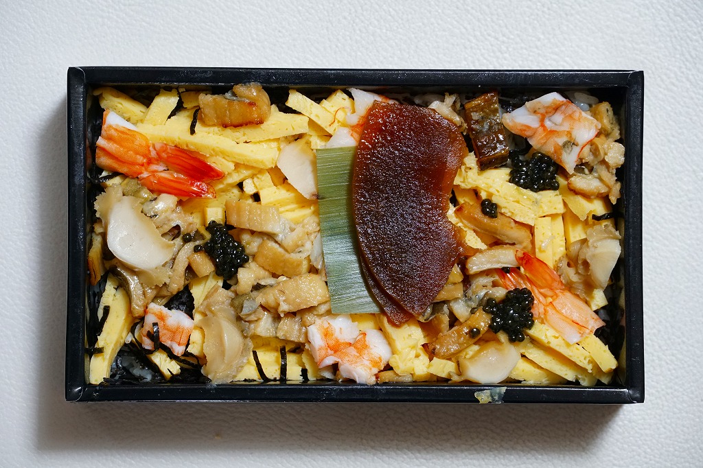 中身はスリーブに書いてあるとおり、いくら、穴子、アワビ、海老、コハダのちらし寿司。刻み海苔やスライス椎茸や厚焼玉子も混じり、奈良漬が載る。味と香りと口当たりの柔らかさが印象的。駅弁のちらし寿司ではかなり高額な商品でも、銀座久兵衛本店のばらちらし1人前をテイクアウトすると3,000円以上あるいは4,000円以上するそうなので、これはお徳だとテレビの情報番組で紹介された。