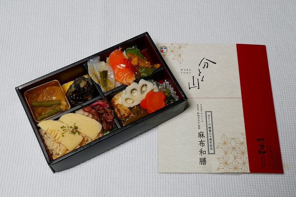 駅弁をよく扱うスーパーで買った弁当に駅弁マークが付いていたので、ここで紹介。2018(平成30)年7月の東京駅の駅弁売店「駅弁屋 祭」での「夏の新作駅弁フェア」で発売か。青森県の八戸駅の駅弁屋が調製する、東京南麻布の懐石料理屋のブランド「分とく山」を名乗る駅弁のひとつ。分とく山開業三十周年記念という文字もある。