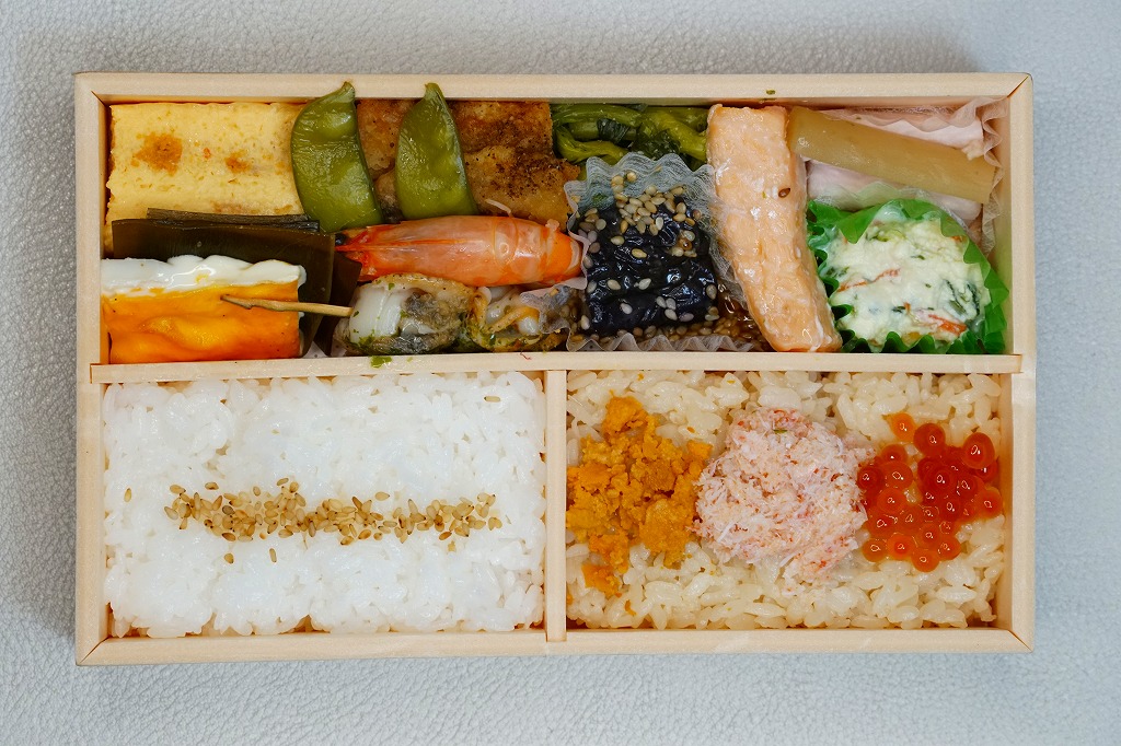 黒塗りの容器に、この駅弁売店の多くの商品でデザインを共有する白いボール紙の枠にはめる。中身は半分が茶飯の上を鮭ハラス、ミツバ、イクラ醤油漬、スクランブルエッグで覆う御飯で、半分がウニとカニの玉子焼、イワシ蒲焼、鶏つみれ、ホッキ貝、ナガイモやごぼうなど。サケがまるで塩辛で、御飯が3センチ厚もある、手にも口にも胃にも重たい感じ。2015年までの販売か。