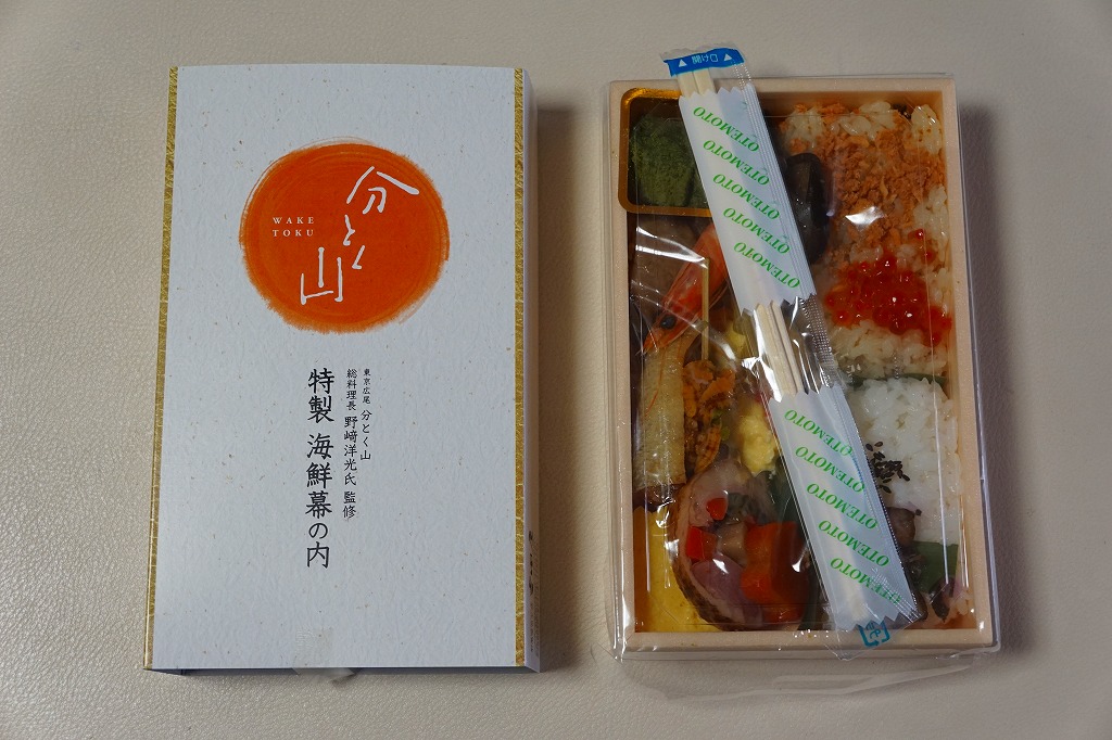 2021(令和3)年の秋の新商品か。2010年12月から続く東京南麻布の日本料理店「分とく山」ブランドの駅弁で、2021年春に5種類で始まった「一流レストランセレクション弁当」シリーズの新作で、八戸駅の駅弁屋が調製し、おそらく主に東京駅で売られる弁当。