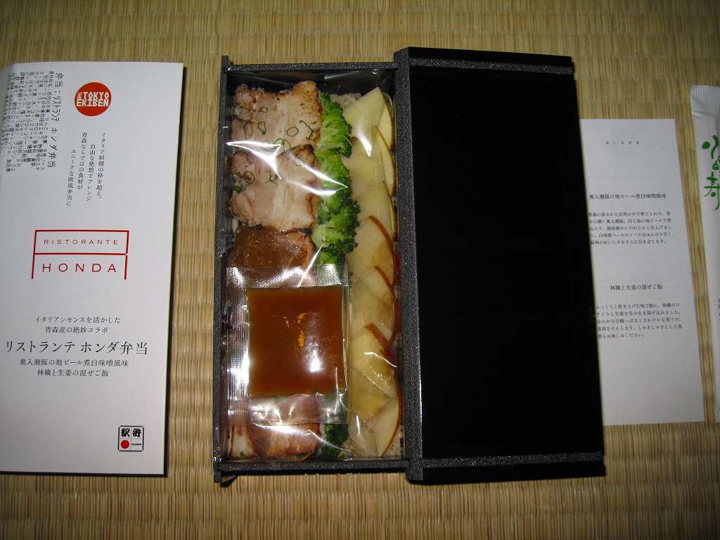 真っ黒な長方形の容器を、商品名とロゴマークと簡単な宣伝文をシンプルに印刷した白いボール紙の枠にはめる。中身はリンゴと生姜の混ぜ御飯の上を、焼豚とブロッコリーとリンゴのスライスで覆うもの。豚肉は奥入瀬豚を使うとあり、リンゴも含め青森と中身が結び付いている。酸味がさわやかで、駅弁らしからぬお洒落な雰囲気。八戸駅弁そのままの箸袋が、ちょっと浮いている。2013年までの販売か。