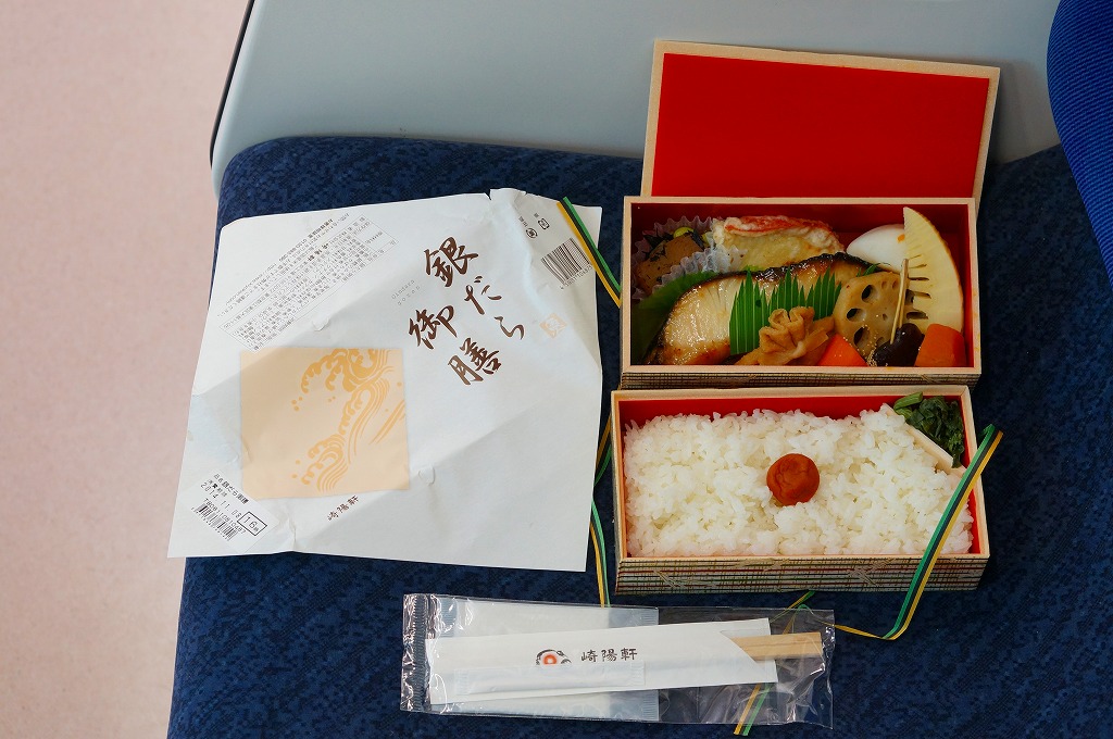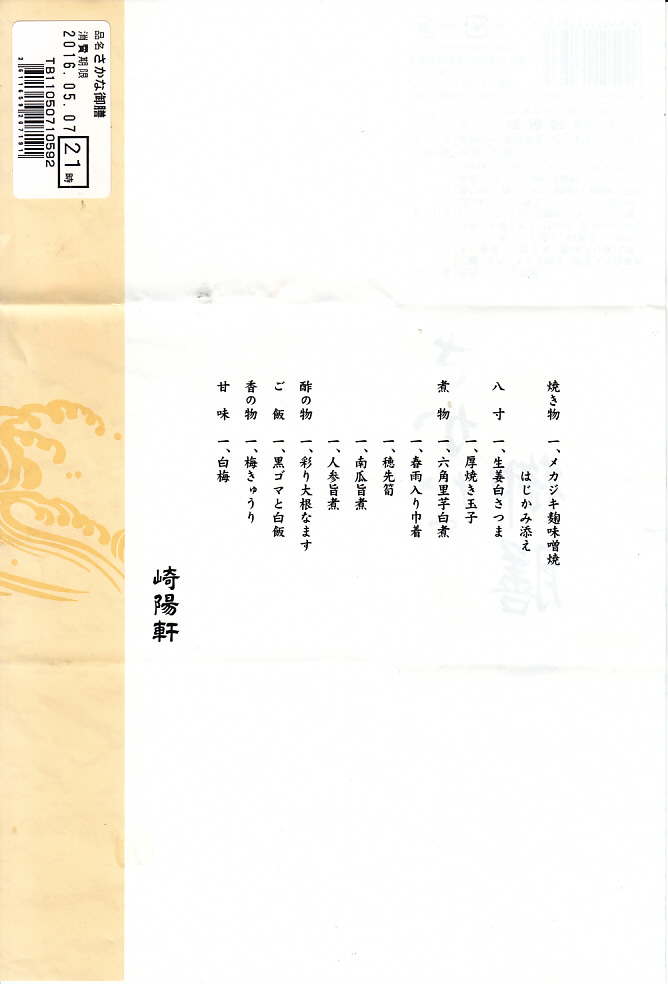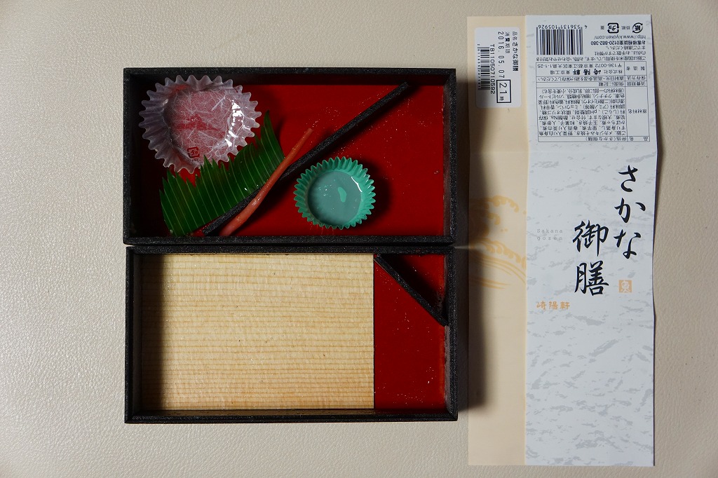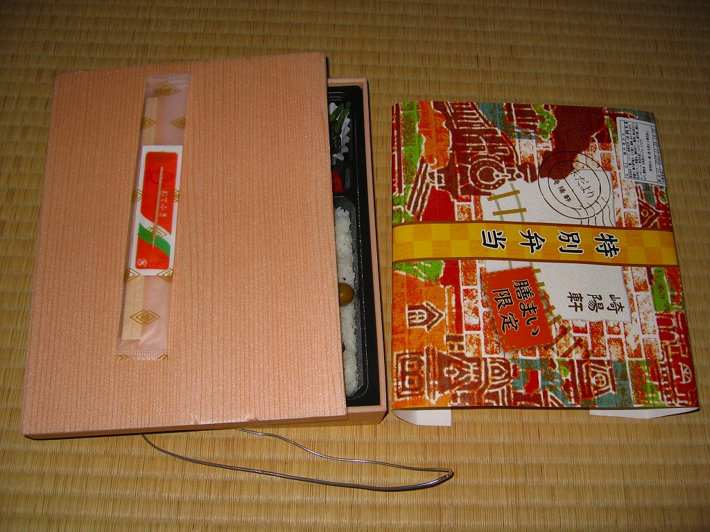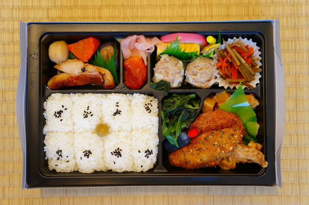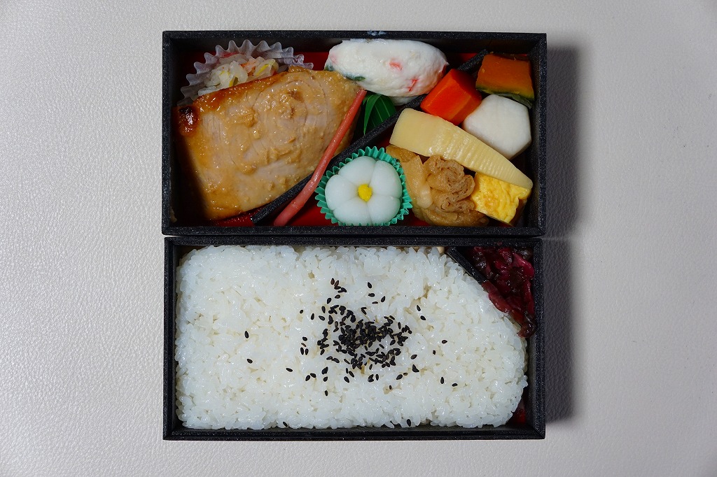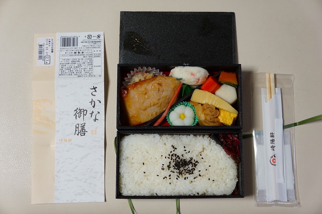 2016(平成28)年3月18日に東京地区と神奈川地区で発売。真っ黒な二段重ねの容器の下段は白御飯と柴漬け、上段は大きなメカジキ麹味噌焼に、タケノコやサトイモなどの煮物、生姜白さつま、大根なます、白梅なる甘味など。駅でも売られるでパ地下タイプの高級弁当。2011年発売の「おべんとう魚」と同じく、崎陽軒の弁当なのにシウマイが入らないが、これは話題にはされなかった。2017年までの販売か。