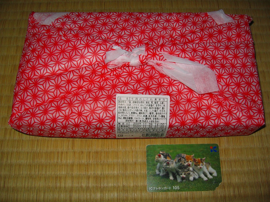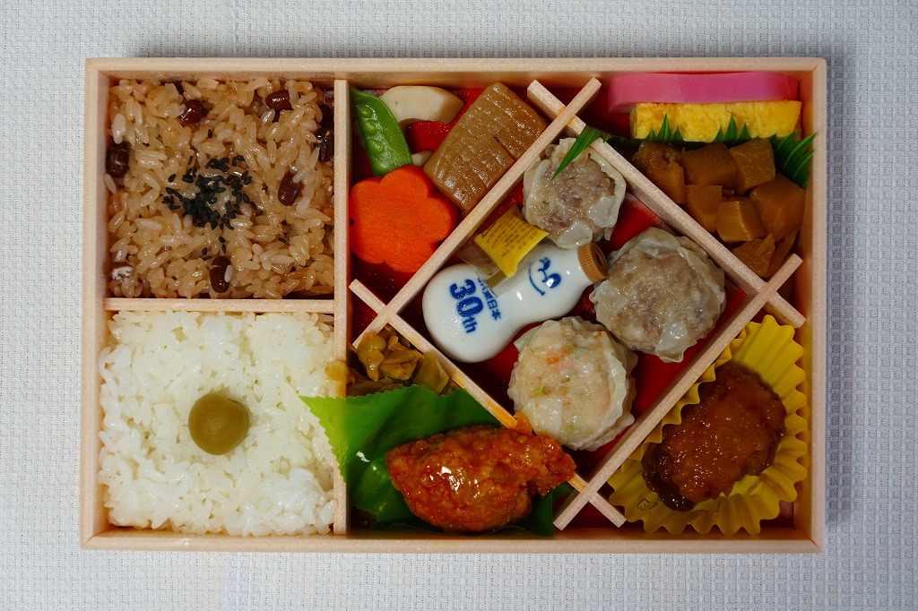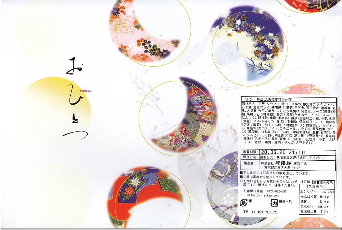 上記の弁当「特別弁当」と同じく、「膳まい」限定販売弁当と思われる。大きく柔らかい木目調の容器を、和紙風の風呂敷で包む。中身は日の丸御飯に牛肉しぐれ煮、アンコウ唐揚げにカニとイカの酢の物、有頭海老に里芋田楽やカボチャその他の煮物、鮭昆布書に特製シウマイ1個、ゆず大福など。