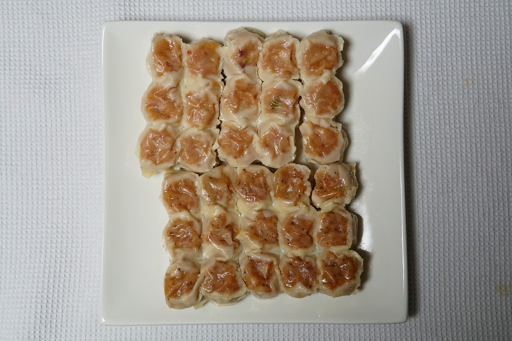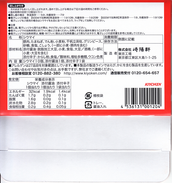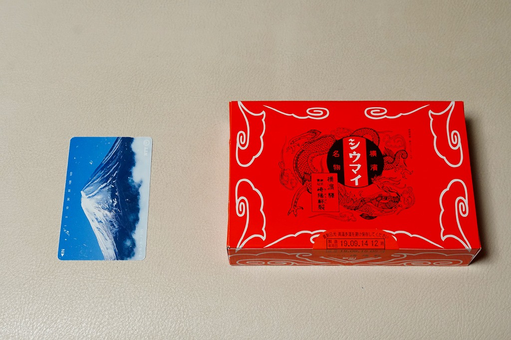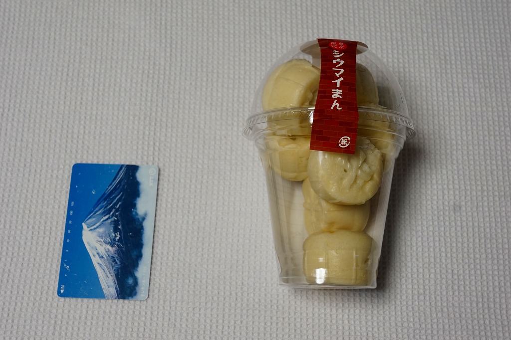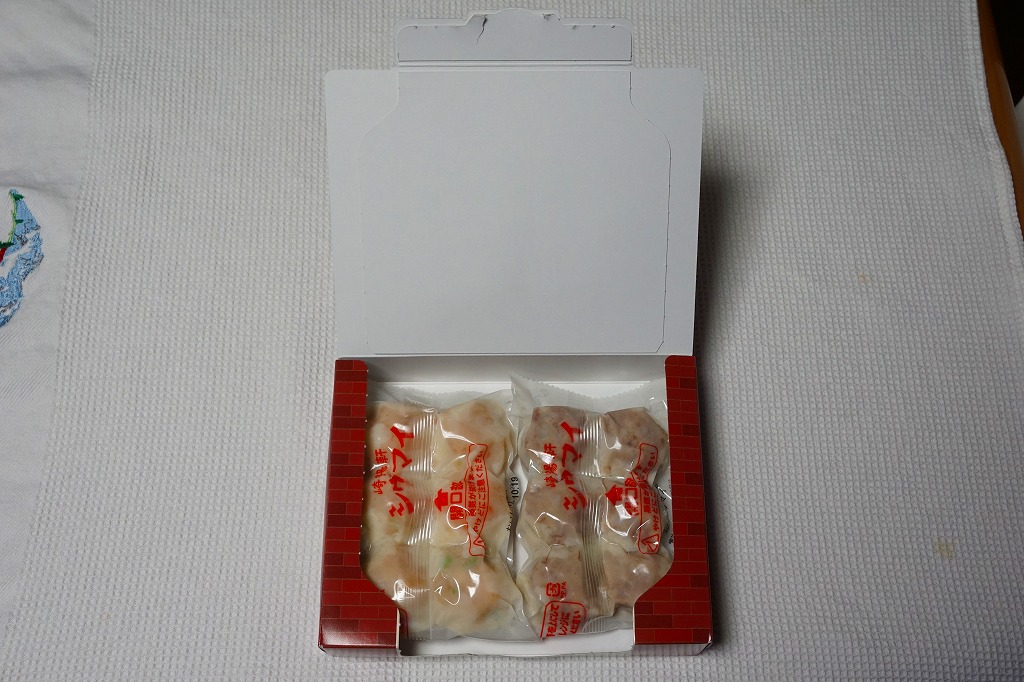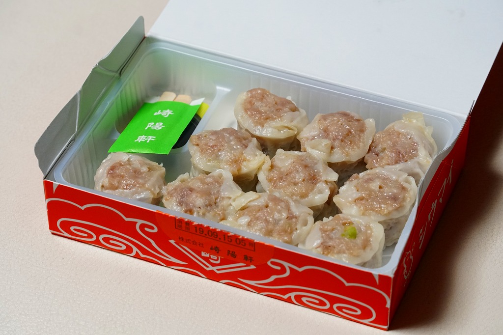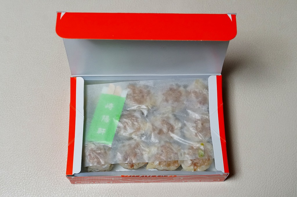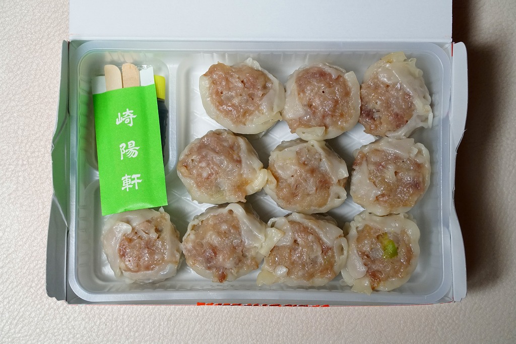 横浜駅の駅弁であるシウマイの、横浜では販売されない10個入りバージョン。おなじみのシウマイが、おなじみの赤いデザインの紙箱の中で、トレーの中に収まっている。横浜や通常の15個入りや、横浜にある6個入りでなく、10個入りというのは、ひとりでつまむのに丁度良いと思えてきた。
